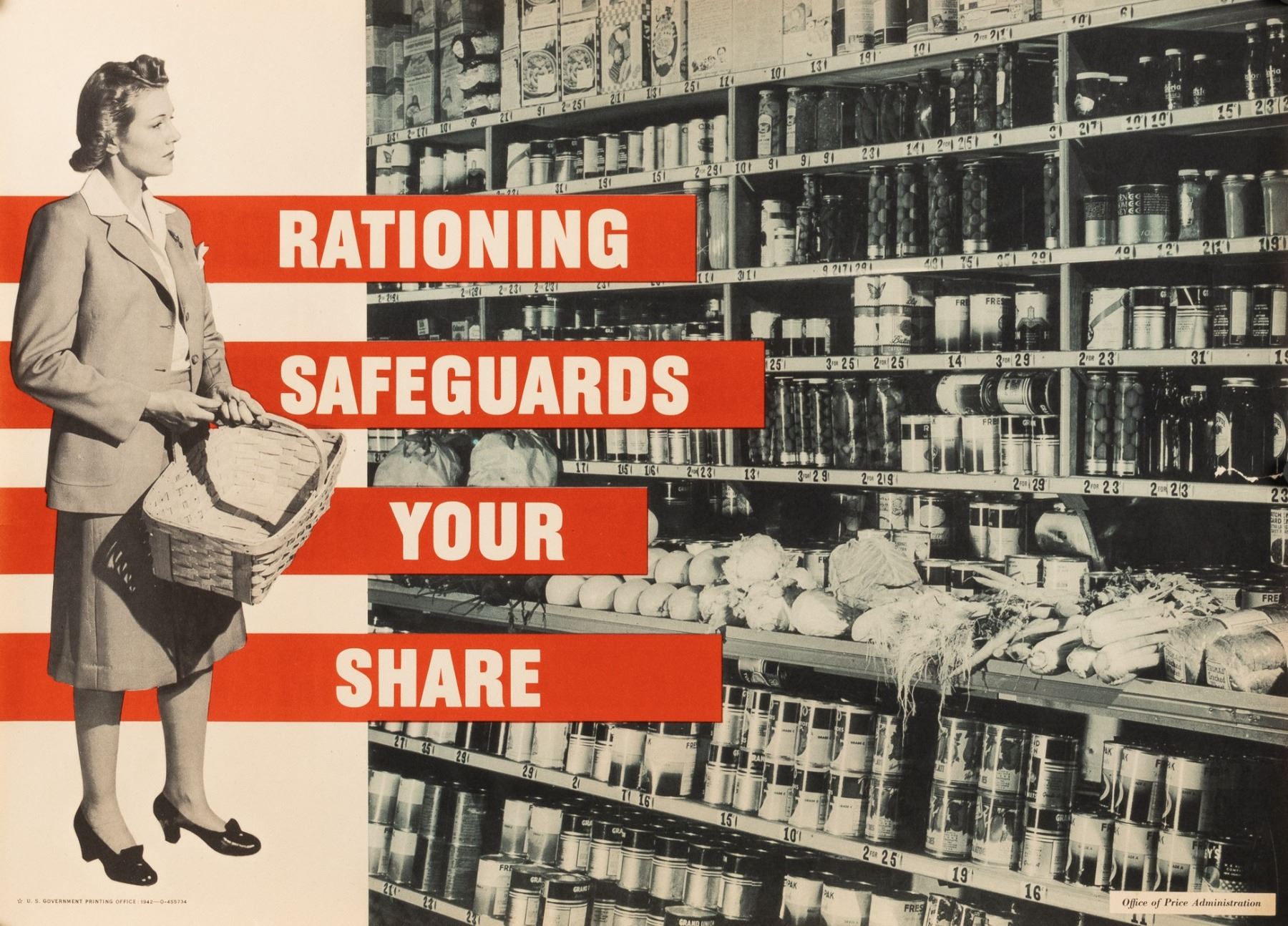 Three posters, 'Rationing Safeguards Your Share', Office of Price Administration, U.S. Government Printing Office 1942-O-455734, 20 x 14.25 inches. Minor tears, damage on right side and one with a 2-inch tear at bottom margin.