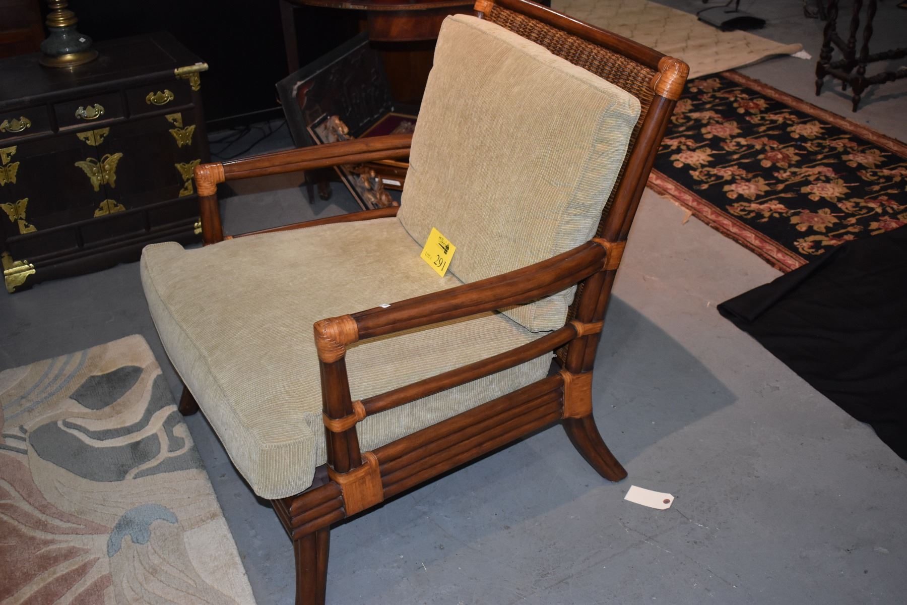RATTAN STYLE ARM CHAIR W/UPHOLSTERED CUSHIONS