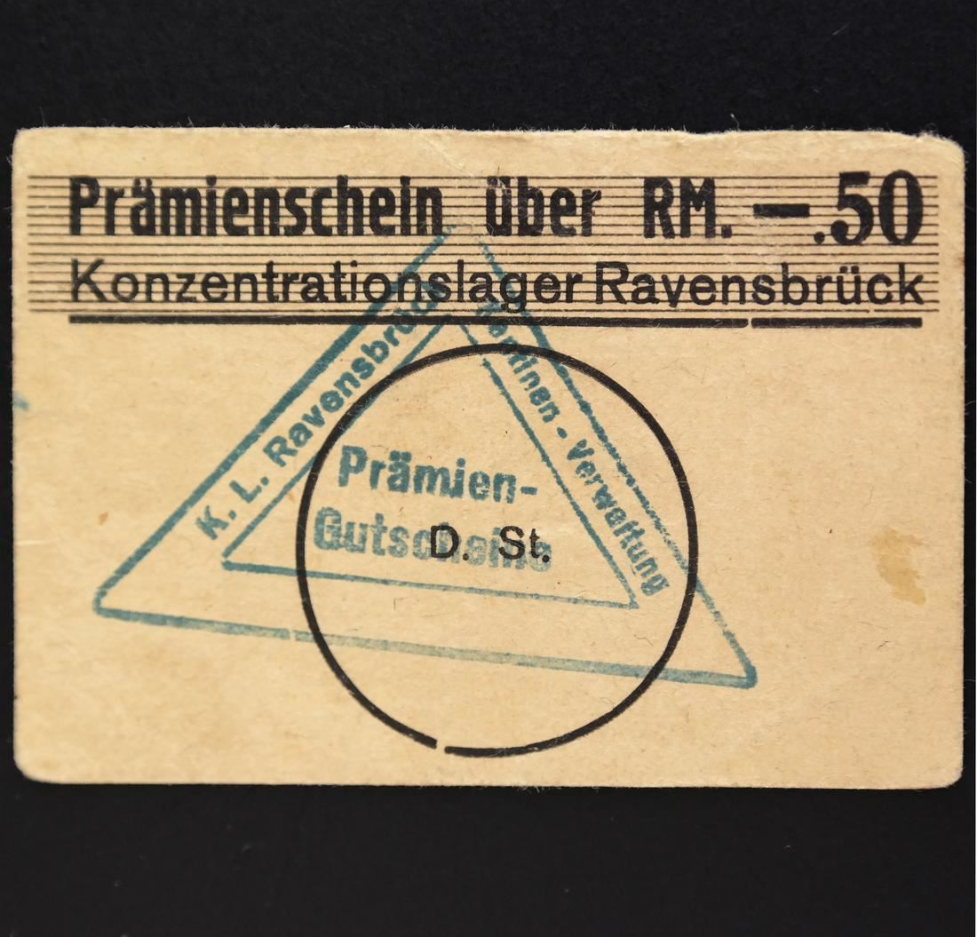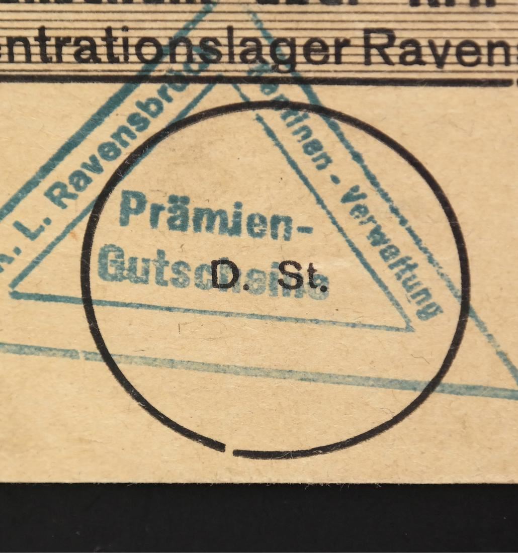 Prmienschein ber RM. -.50 / Konzentrationslager Ravensbrck on cream card, blue triangular control handstamp, measures approx 75 by 52mm, thins to back from being glued down, Fine.
