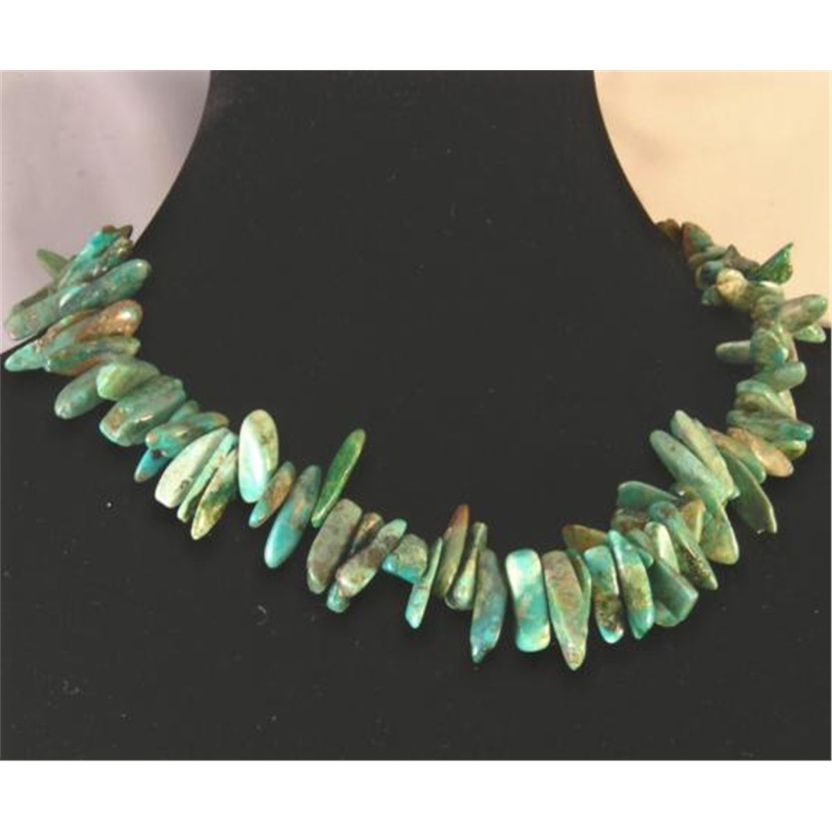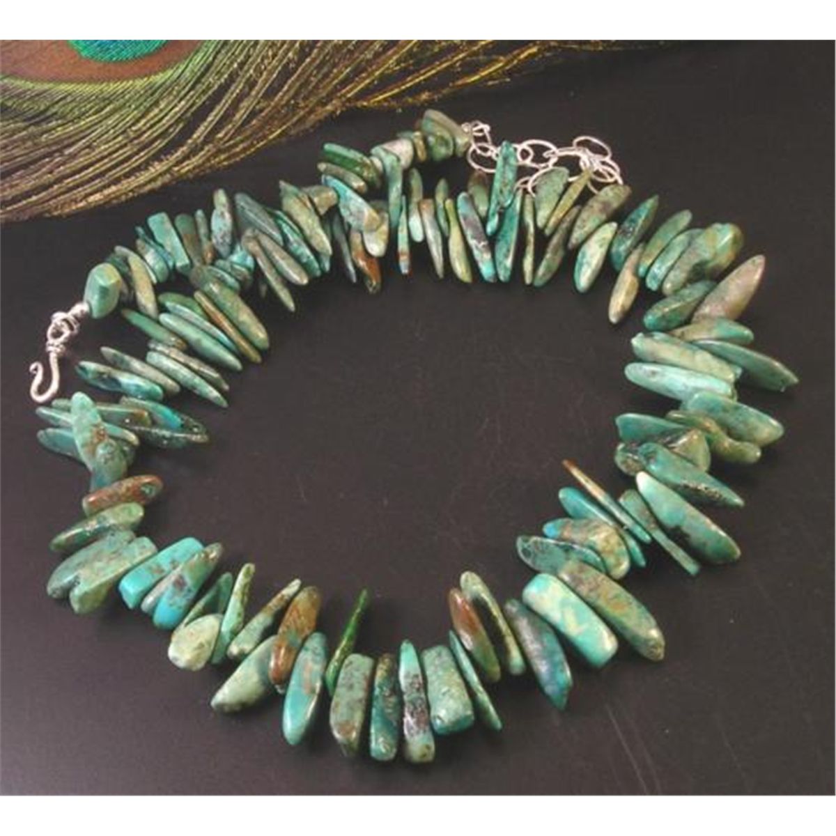 RAVISHING BLUE GREEN GRADUATED TURQUOISE NECKLACE, Incredible blue-green turquoise with brown matrix in beautiful large chips are strung from large to small to make a wonderful collar for your neck. So beautiful! The turquoise chip nuggets are 3/4in long at the center, gradually decreasing to 7/16in long at the clasp. Ornate sterling silver hook-and-eye clasp and chain makes the necklace adjustable from 17in to 20in long overall.