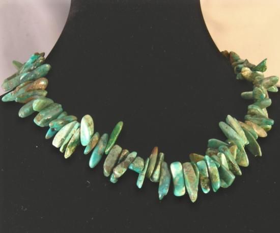 RAVISHING BLUE GREEN GRADUATED TURQUOISE NECKLACE, Incredible blue-green turquoise with brown matrix in beautiful large chips are strung from large to small to make a wonderful collar for your neck. So beautiful! The turquoise chip nuggets are 3/4in long at the center, gradually decreasing to 7/16in long at the clasp. Ornate sterling silver hook-and-eye clasp and chain makes the necklace adjustable from 17in to 20in long overall.