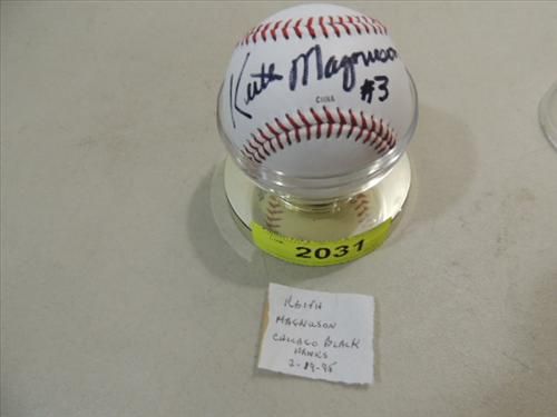 RAWLINGS BASEBALL AUTOGRAPH KEITH MAGNUSON NO COA. BLACK HAWK HOCKEY PLAYER. SIGNED 02/19/95. AS SHOWN. VIEW PICTURE FOR DETAIL. PLEASE BE ADVISED, AND INFORMED REGARDING SIGNATURES OR AUTOGRAPHS THAT WE SELL AT AUCTION: WE ARE NOT AUTHENTICATORS, AND WE DO NOT AUTHENTICATE, OR VALIDATE ANY AUTOGRAPHS OR SIGNATURES THAT WE OFFER AT AUCTION. SOME AUTOGRAPHS OR SIGNATURES MAY COME WITH AN AUTHENTICATION FROM ANY ONE OF LITERALLY HUNDREDS OF AUTHENTICATORS ACROSS THE COUNTRY, AND AROUND THE WORLD. WE DO NOT ENDORSE ANY AUTHENTICATOR, NOR DO WE GUARANTEE THAT ANY AUTOGRAPH OR SIGNATURE IS AUTHENTIC, OR THAT IT WILL PASS AUTHENTICATION BY ANY AUTHENTICATOR. ALL AUTOGRAPHS OR SIGNATURES ARE SOLD