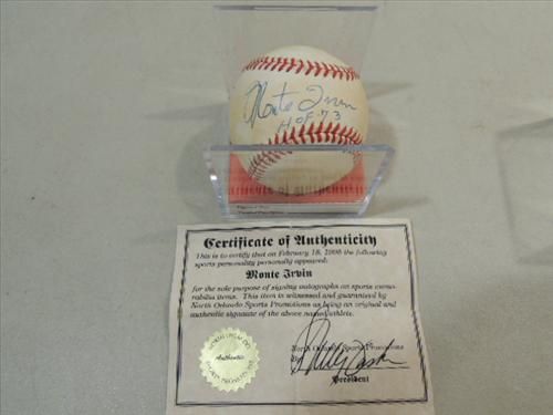 RAWLINGS BASEBALL AUTOGRAPH MONTE IRVIN COA. INLCUDES COA FROM NORTH ORLANDO SPORTS PROMOTIONS. AS SHOWN. VIEW PICTURE FOR DETAIL. PLEASE BE ADVISED, AND INFORMED REGARDING SIGNATURES OR AUTOGRAPHS THAT WE SELL AT AUCTION: WE ARE NOT AUTHENTICATORS, AND WE DO NOT AUTHENTICATE, OR VALIDATE ANY AUTOGRAPHS OR SIGNATURES THAT WE OFFER AT AUCTION. SOME AUTOGRAPHS OR SIGNATURES MAY COME WITH AN AUTHENTICATION FROM ANY ONE OF LITERALLY HUNDREDS OF AUTHENTICATORS ACROSS THE COUNTRY, AND AROUND THE WORLD. WE DO NOT ENDORSE ANY AUTHENTICATOR, NOR DO WE GUARANTEE THAT ANY AUTOGRAPH OR SIGNATURE IS AUTHENTIC, OR THAT IT WILL PASS AUTHENTICATION BY ANY AUTHENTICATOR. ALL AUTOGRAPHS OR SIGNATURES ARE SOLD