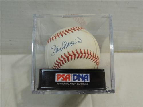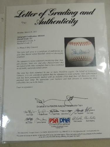 RAWLINGS BASEBALL AUTOGRAPH STAN MUSIAL COA. INCLUDES COA FROM PSA/DNA MO1810. GRADED 8.5 OVERALL QUALITY. AS SHOWN. VIEW PICTURE FOR DETAIL.