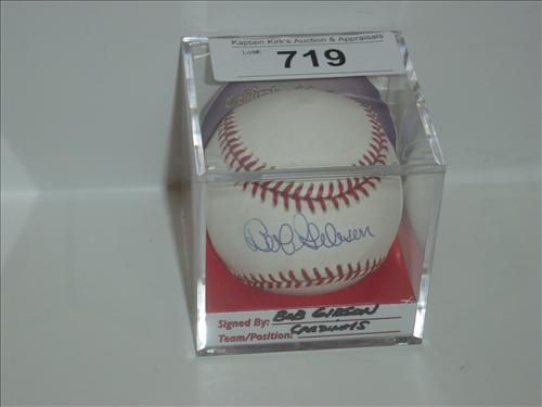 RAWLINGS OFFICIAL LEAGUE BASEBALL SIGNED BY BOB GIBSON OF THE ST. LOUIS CARDINALS. BALL COMES WITH A CERTIFICATE OF AUTHENTICITY FROM TREAT. AS SHOWN. VIEW PICTURE FOR DETAIL.