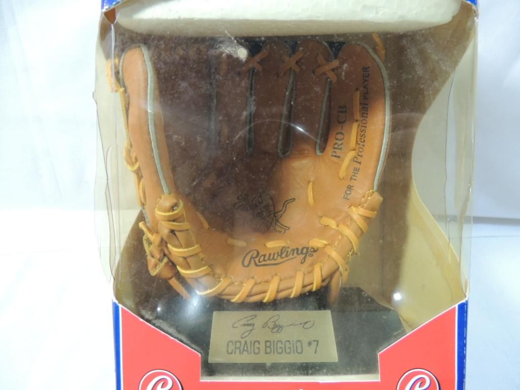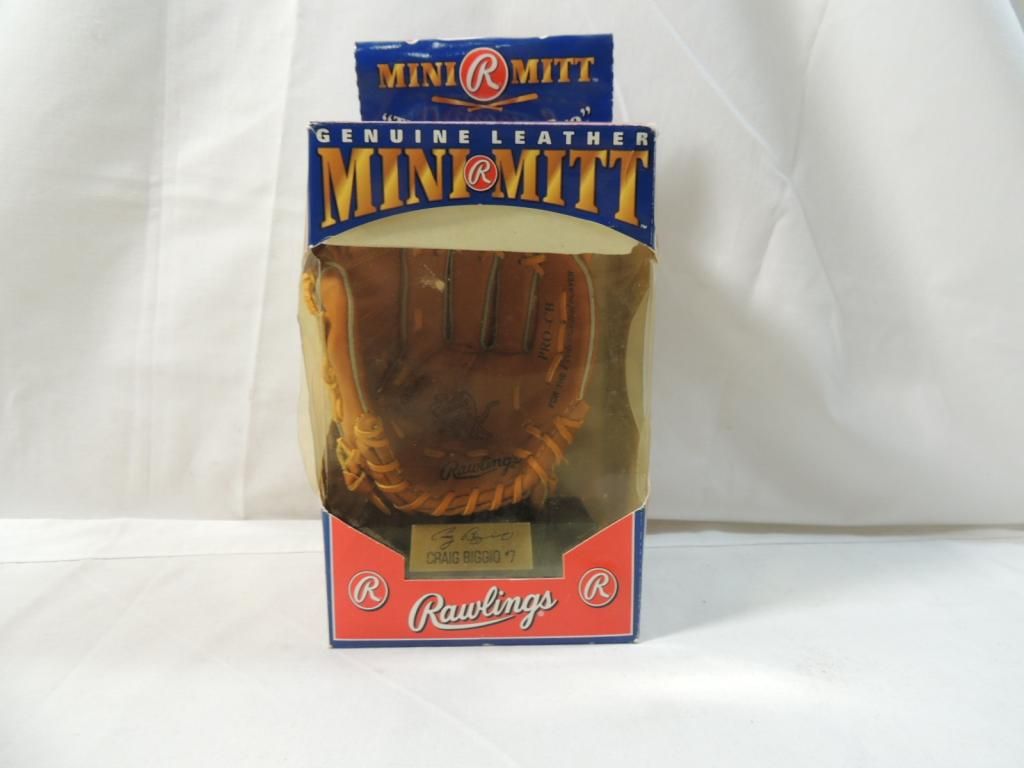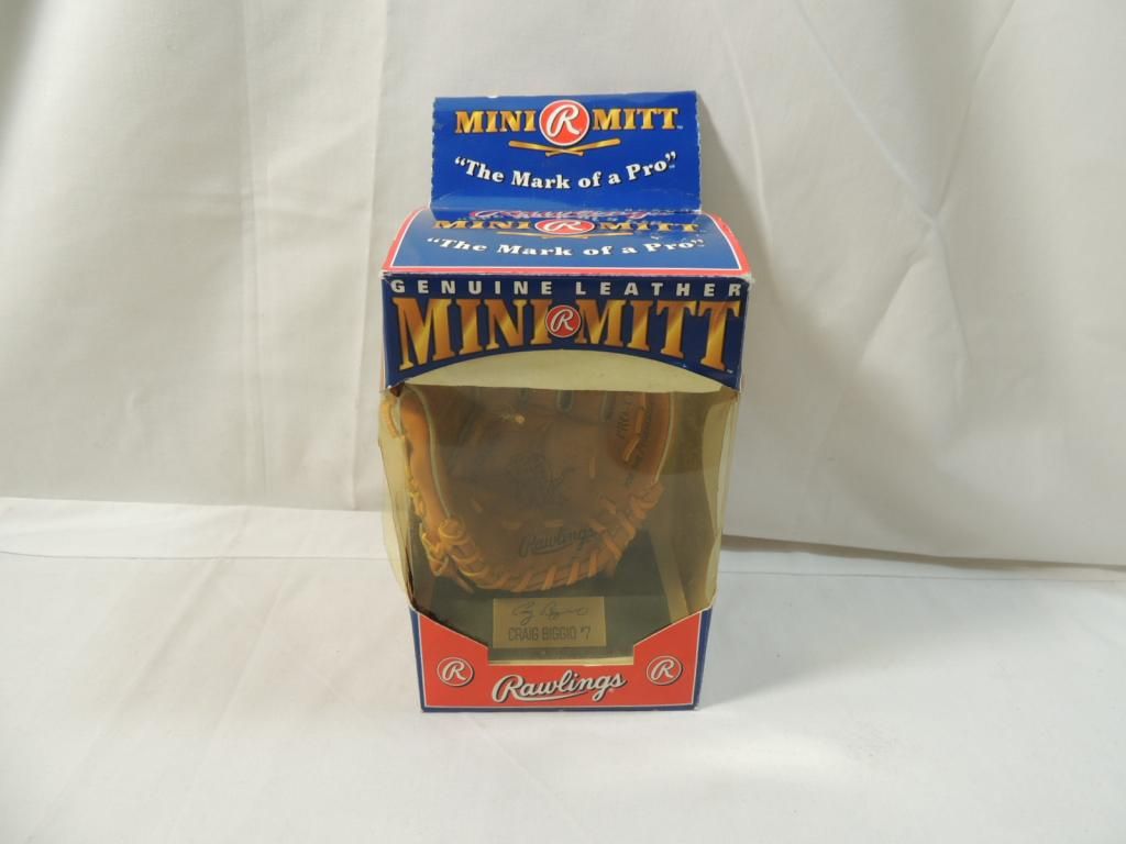 NEW IN BOX RAWLINGS MINI MITT. GENUINE LEATHER. CRAIG BIGGIO. REPLICA MINI GLOVE. DISPLAY STAND WITH ENGRAVING PLATE. BACK WINDOW FOR PHOTOGRAPH. AS SHOWN. SEE PHOTO FOR DETAILS.