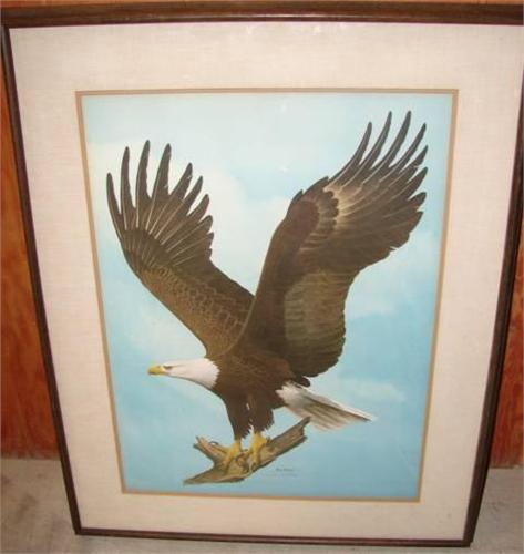 RAY HARM PRINT OF BALD EAGLE. Signed at bottom. 29" x 36.5" framed