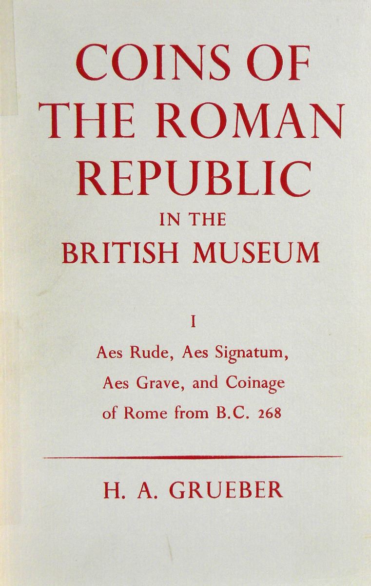 Grueber, H.A. COINS OF THE ROMAN REPUBLIC IN THE BRITISH MUSEUM. Reprint. London, 1970. Three volumes. Tall 8vo, original matching red cloth, gilt; jackets. cxxv, (1), 594; (6), 592; (6), 236 pages; tables; text illustrations; 123 plates of coins. Minor jacket wear (first volume’s jacket taped); near fine. Still widely used and particularly valuable for historical notes. Clain-Stefanelli 3718*. Ex RBW Library.