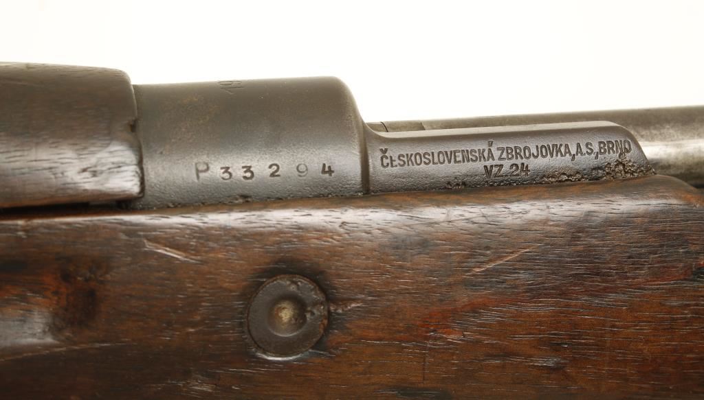 Czechoslovakian made military blued bolt-action rifle with a 23-1/2" barrel and a leather sling. Dated 1937. Bluing has faded to a brown patina with pin-prick pitting. Wood has matching serial number over-stamped by oriental characters in cartouches and 2 other stamps in diamonds that I can't read. There are numerous deep dings and other dents and scratches. Bore is dark with strong rifling. Action is good. Condition is poor. *Modern Firearm*