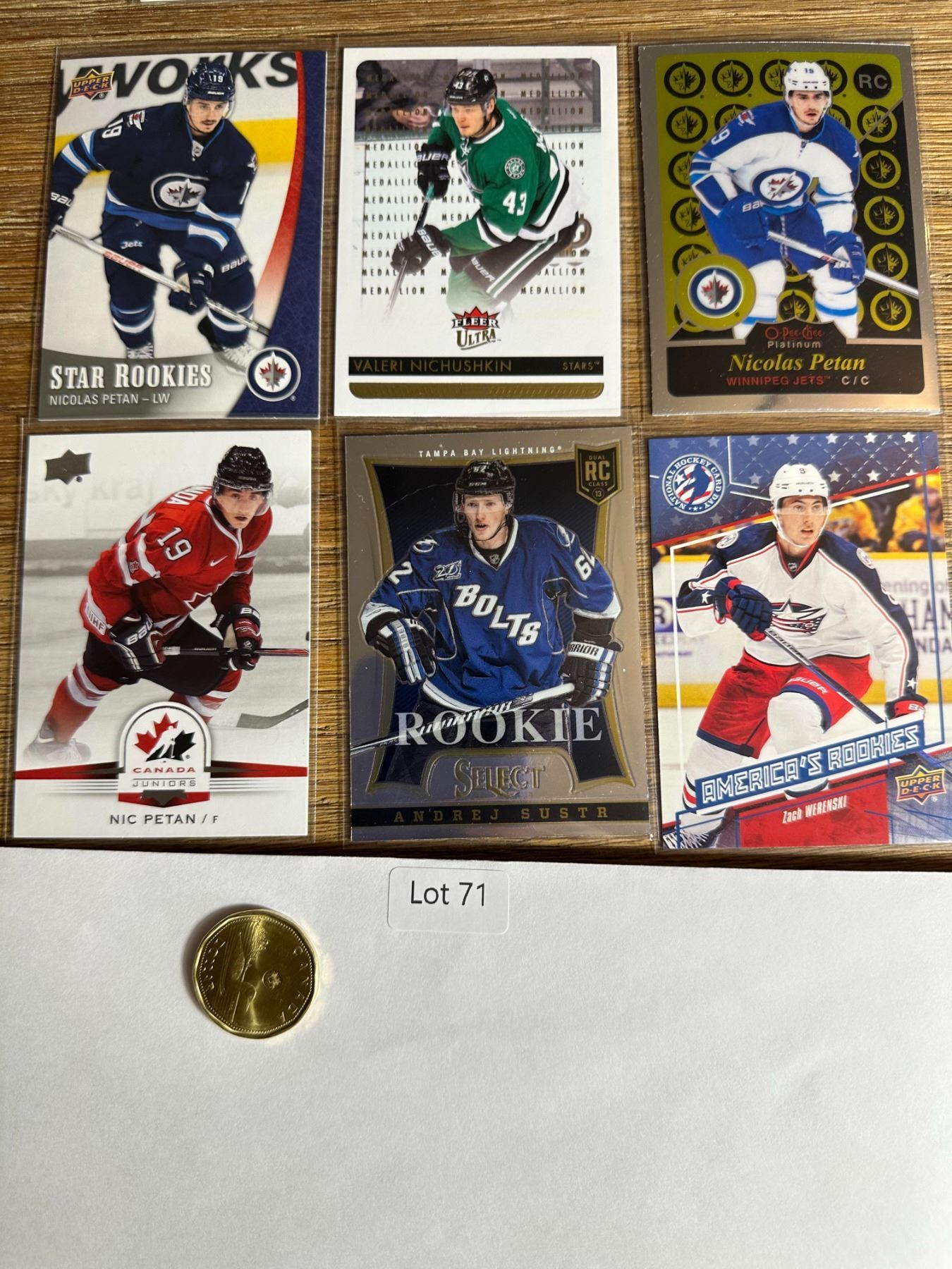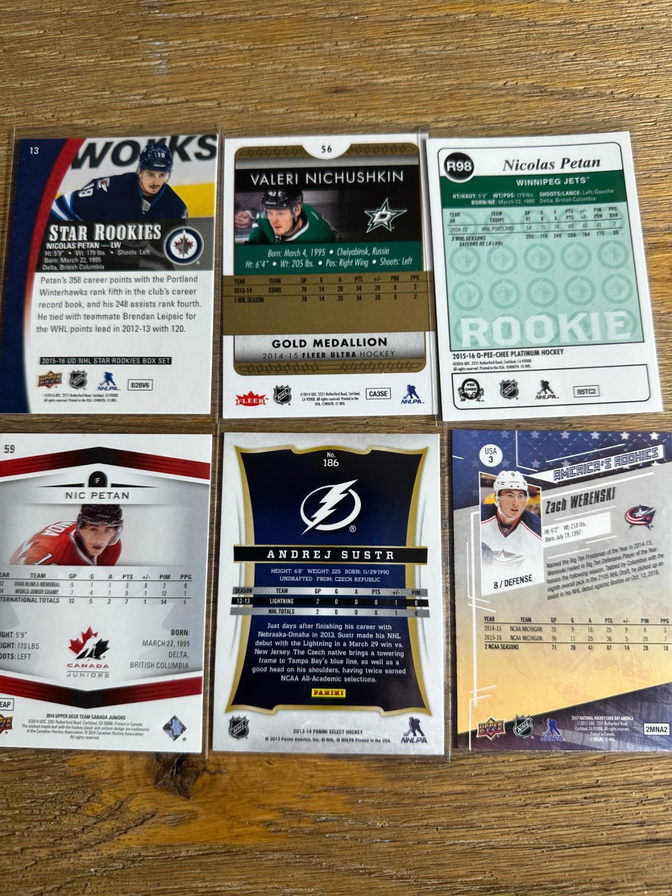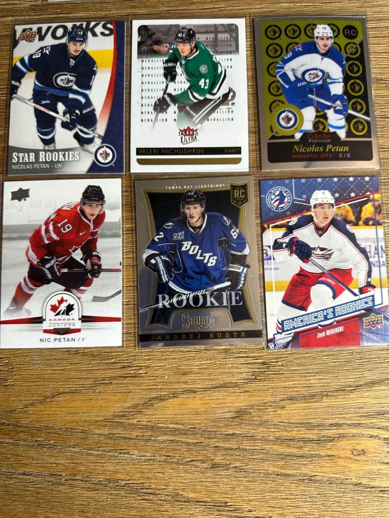 Six-card mix with Nicolas Petan Star RCs, Valeri Nichushkin Fleer Ultra Gold Medallion, Andrej Sustr Select RC, Zach Werenski America’s RCs, and Team Canada Petan. - Hockey Card