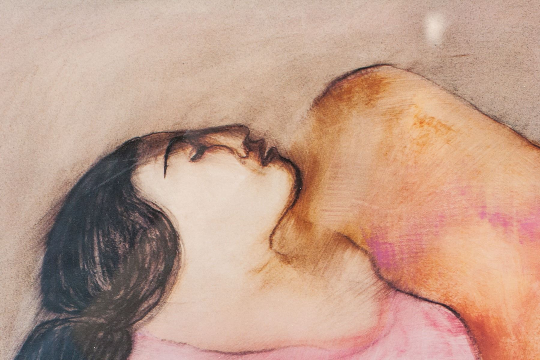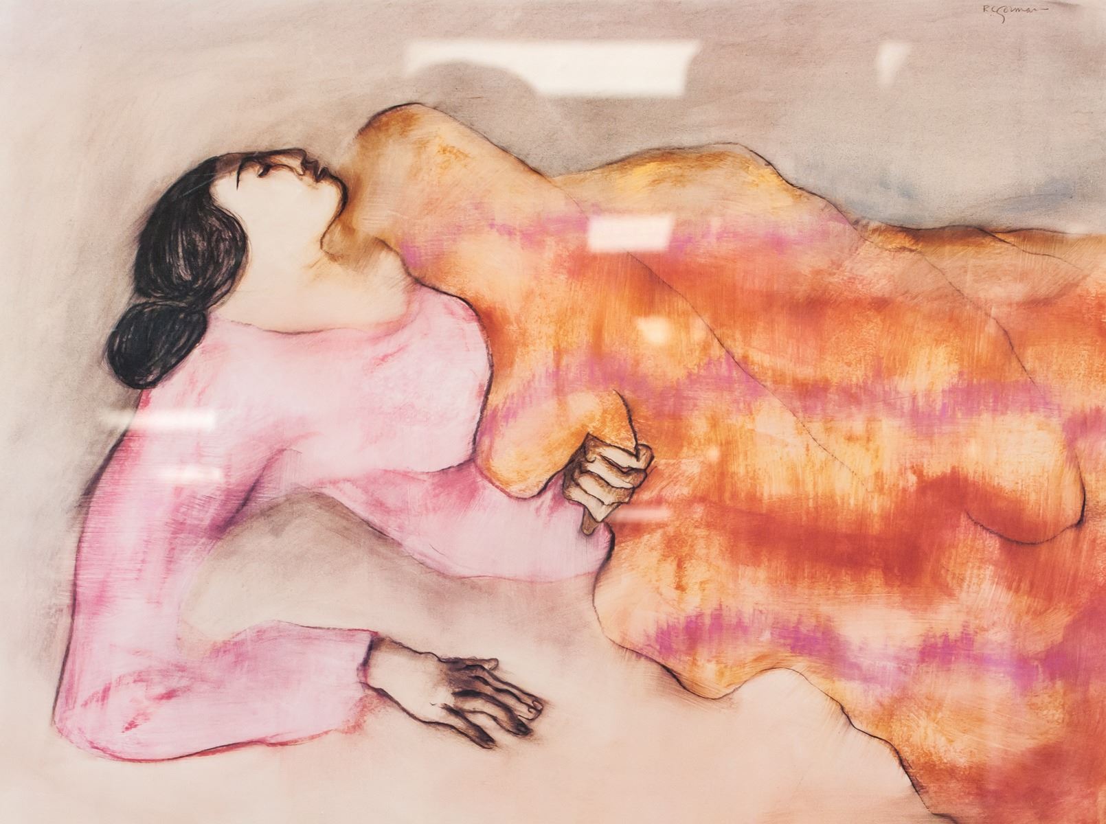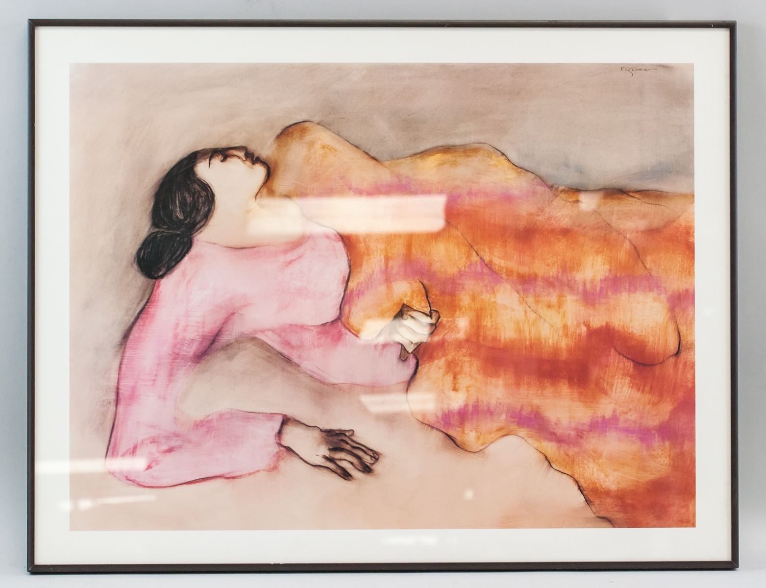 Print on paper, framed. Featuring a woman in a reclined position with an orange blanket pulled up to her chest. "RC Gorman" printed in the top right corner. "SALVANNA" inscribed on a label on verso. 51 x 66 cm (20 x 25.75 in).
