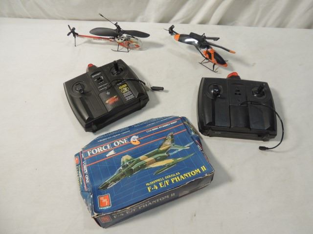 TWO WORKING REMOTE CONTROL MINI HELICOPTORS, AND VINTAGE F-4 PHANTOM MODEL KIT FROM AMT, COMPLETE IN ORIGINAL BOX. ALL FOR ONE MONEY!!