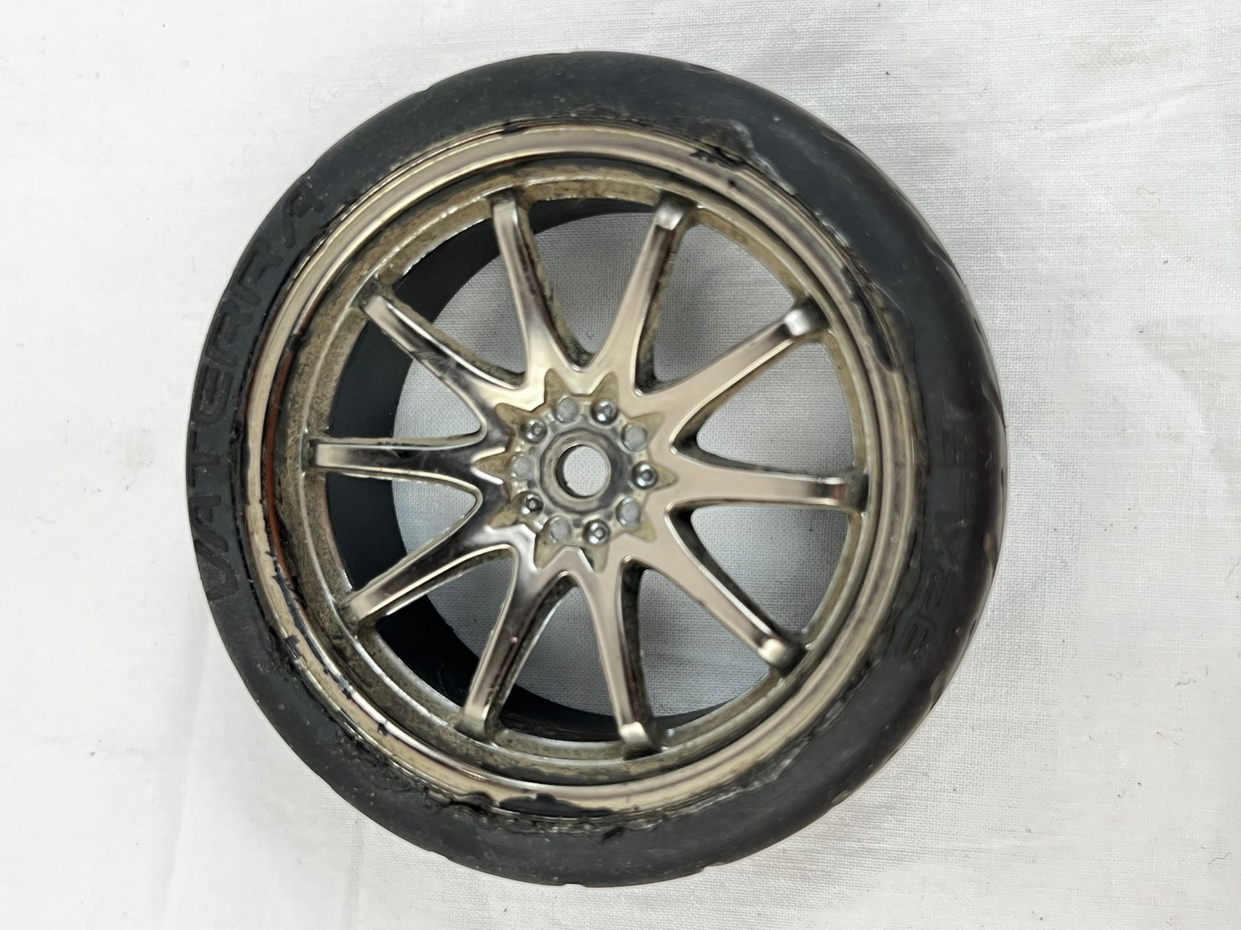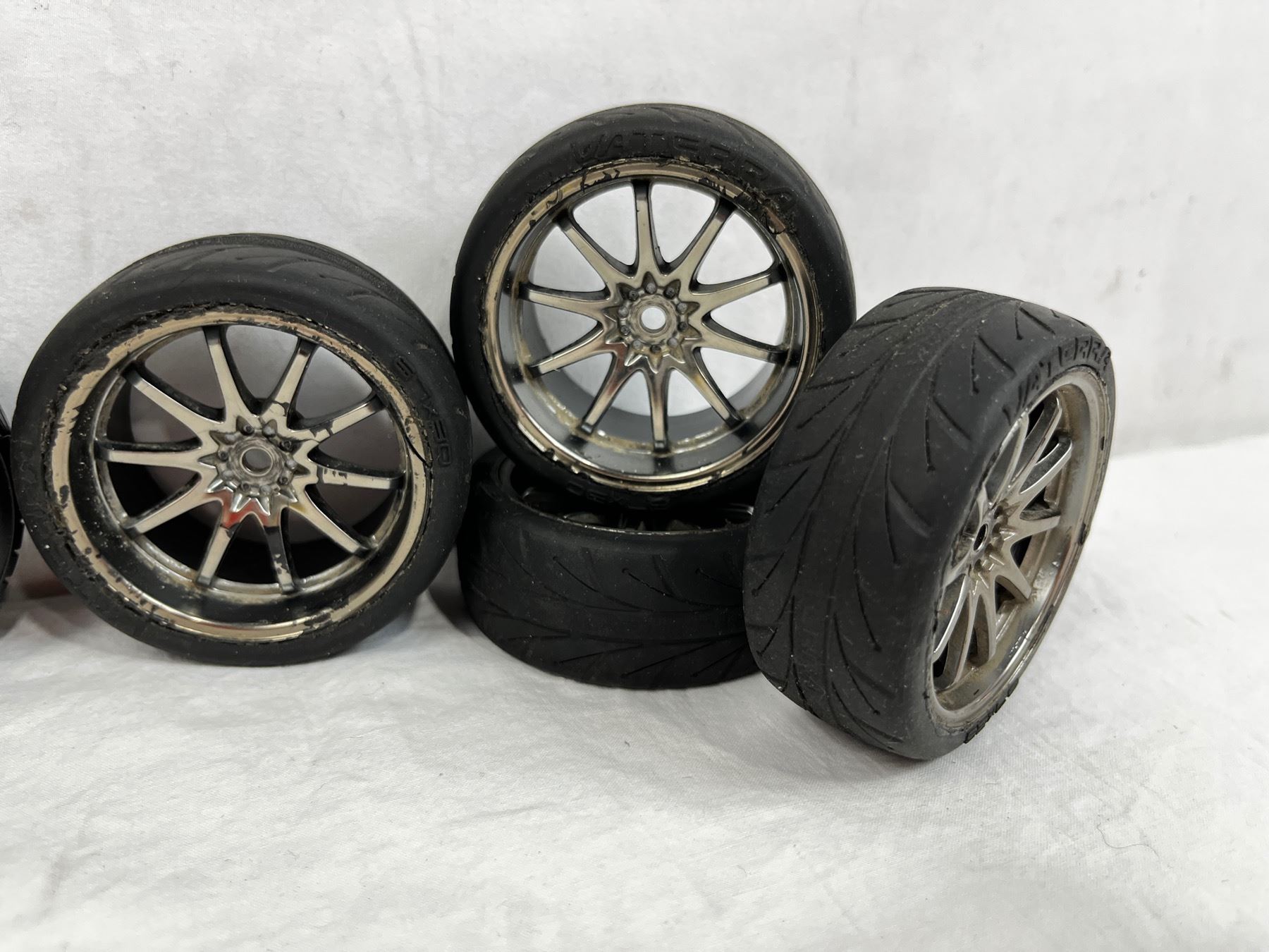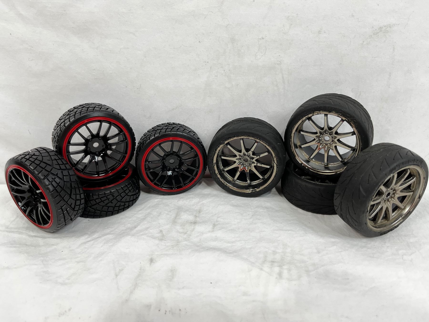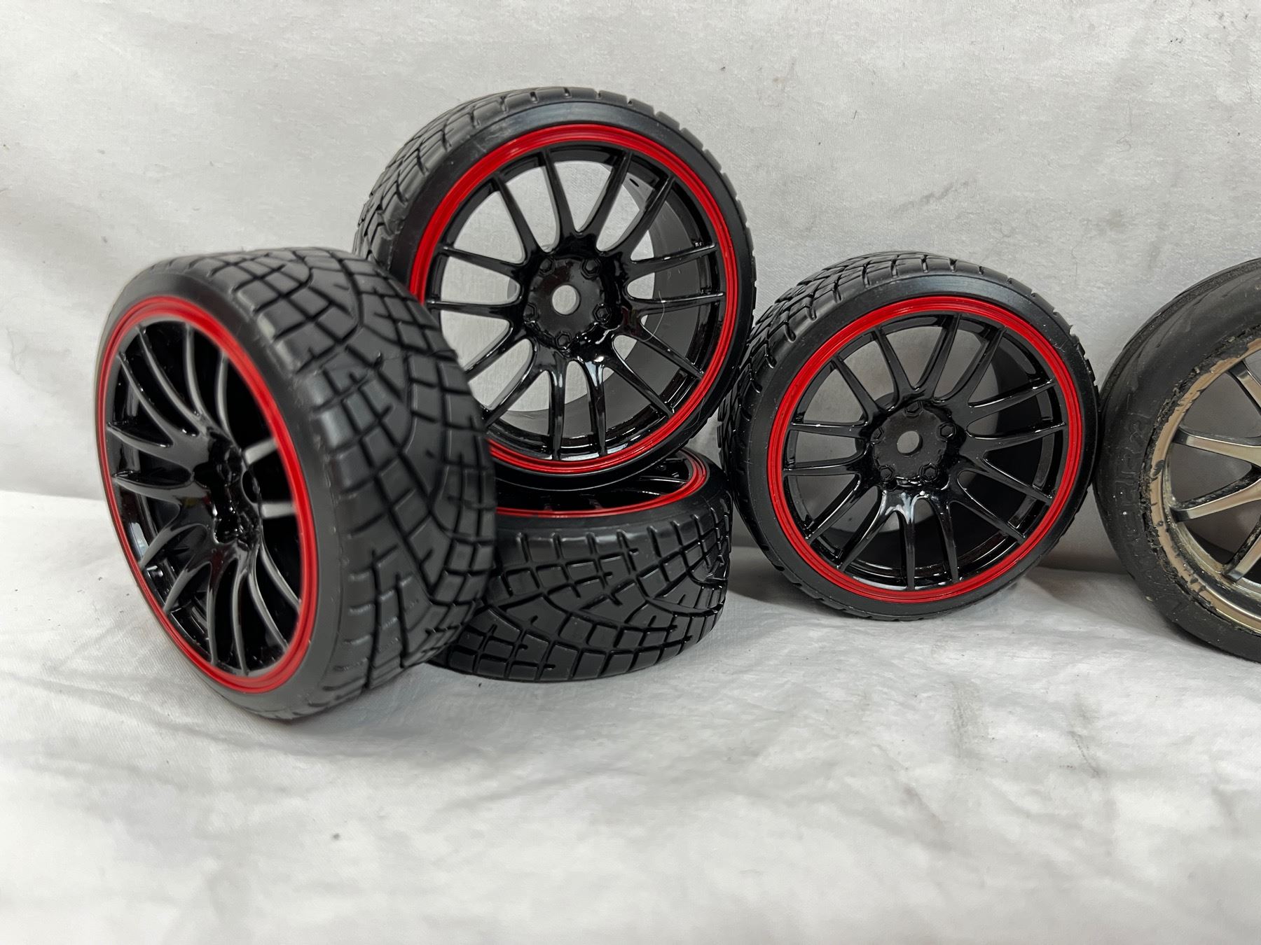 1 set of 4 is black rims with rubber wheels, 2 sets of 4 is red rims with hard plastic wheels