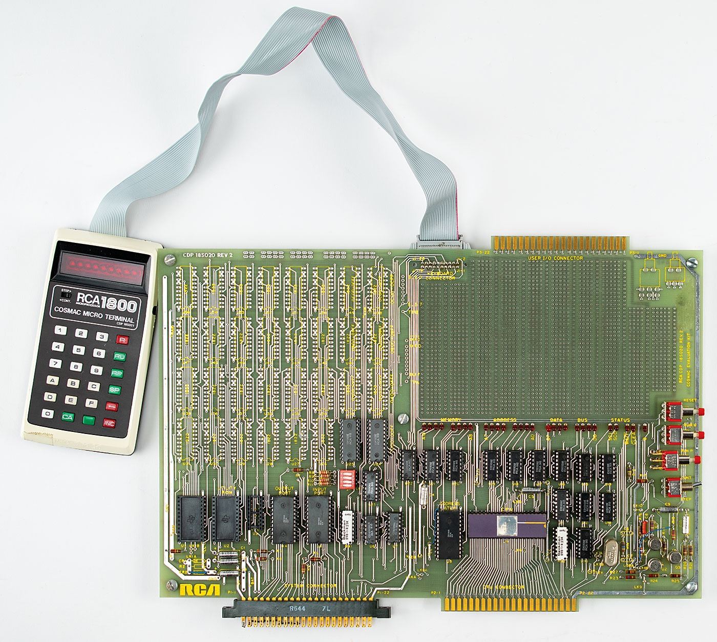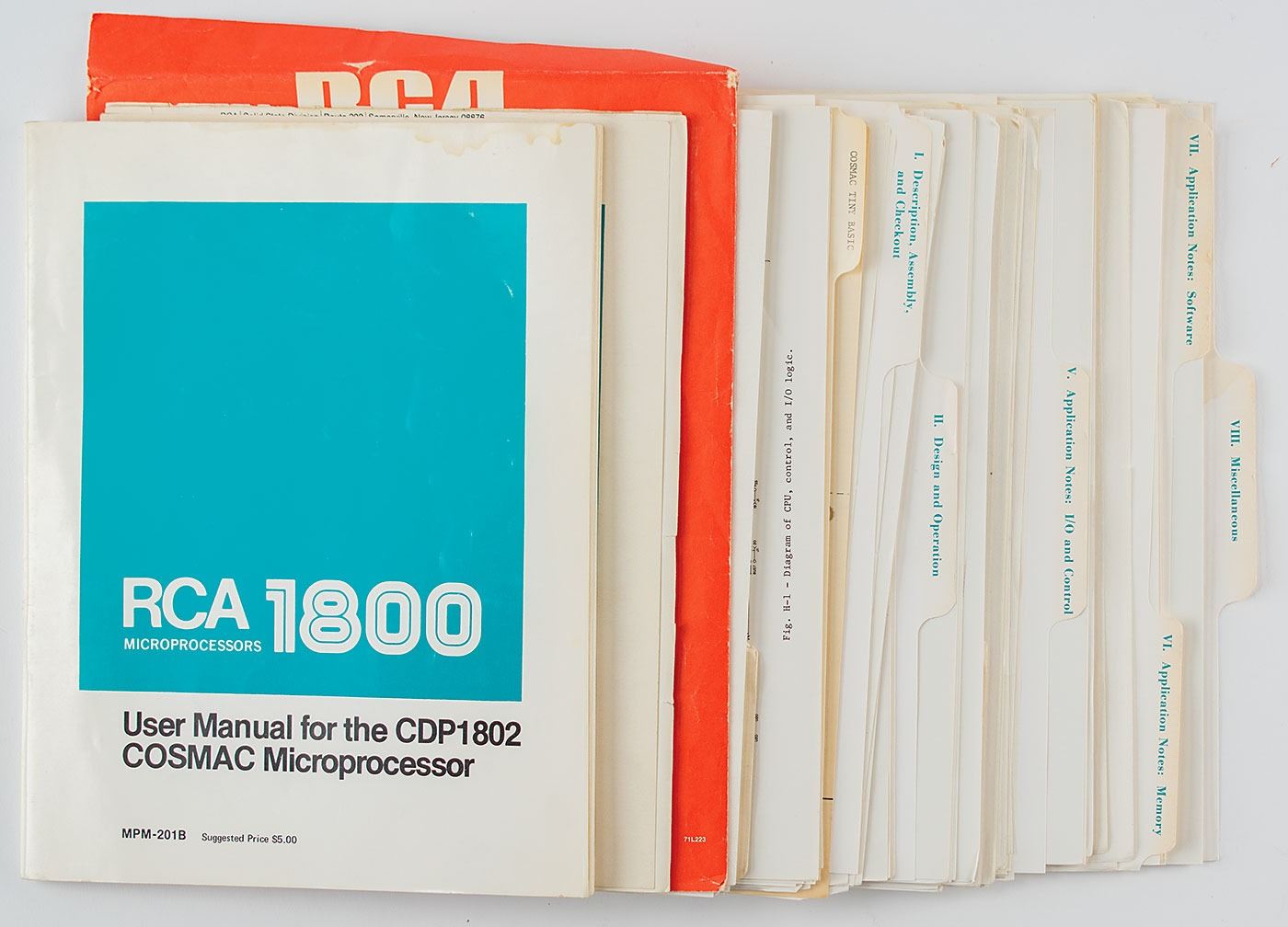 Desirable RCA COSMAC CDP18S020 (Rev. 2) Evaluation Board with RCA 1800 COSMAC Micro Terminal (CDP 18S021), featuring a CDP1802 microprocessor: a one-chip CMOS 8-bit register-oriented central processing unit introduced in 1976. Includes an introduction summary booklet for the microprocessor, a user manual for the microprocessor, an instruction manual for the microterminal, and a thick disbound manual for the evaluation kit, with supplementary material. In fine condition. The RCA COSMAC 1800 series represented a leap forward in low power consumption, making the chips ideally suited for portable applications: they saw use in everything from spacecraft to pinball machines.