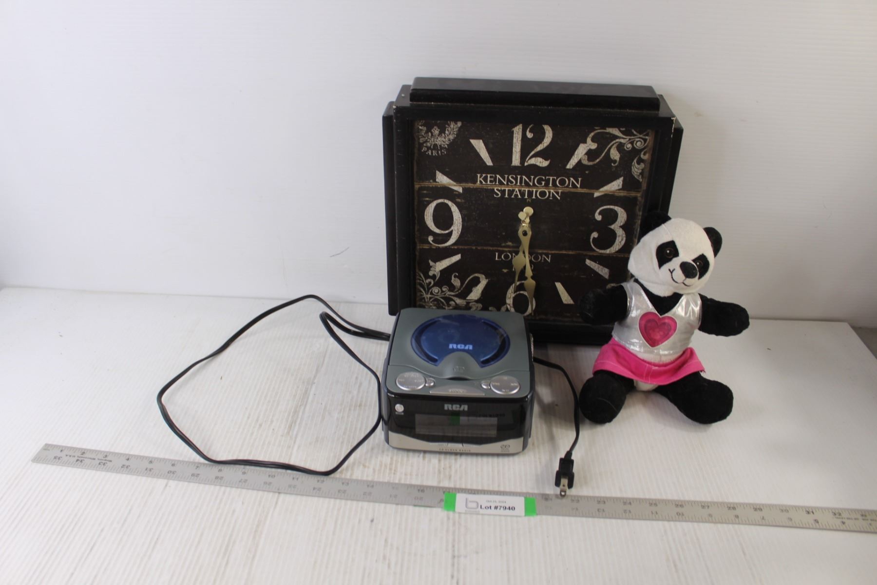 RCA CD Clock Radio (6.25" x 6.75" x 3" Tall) as is, Wall Clock, Mini Skirt Panda Stuffed Toy