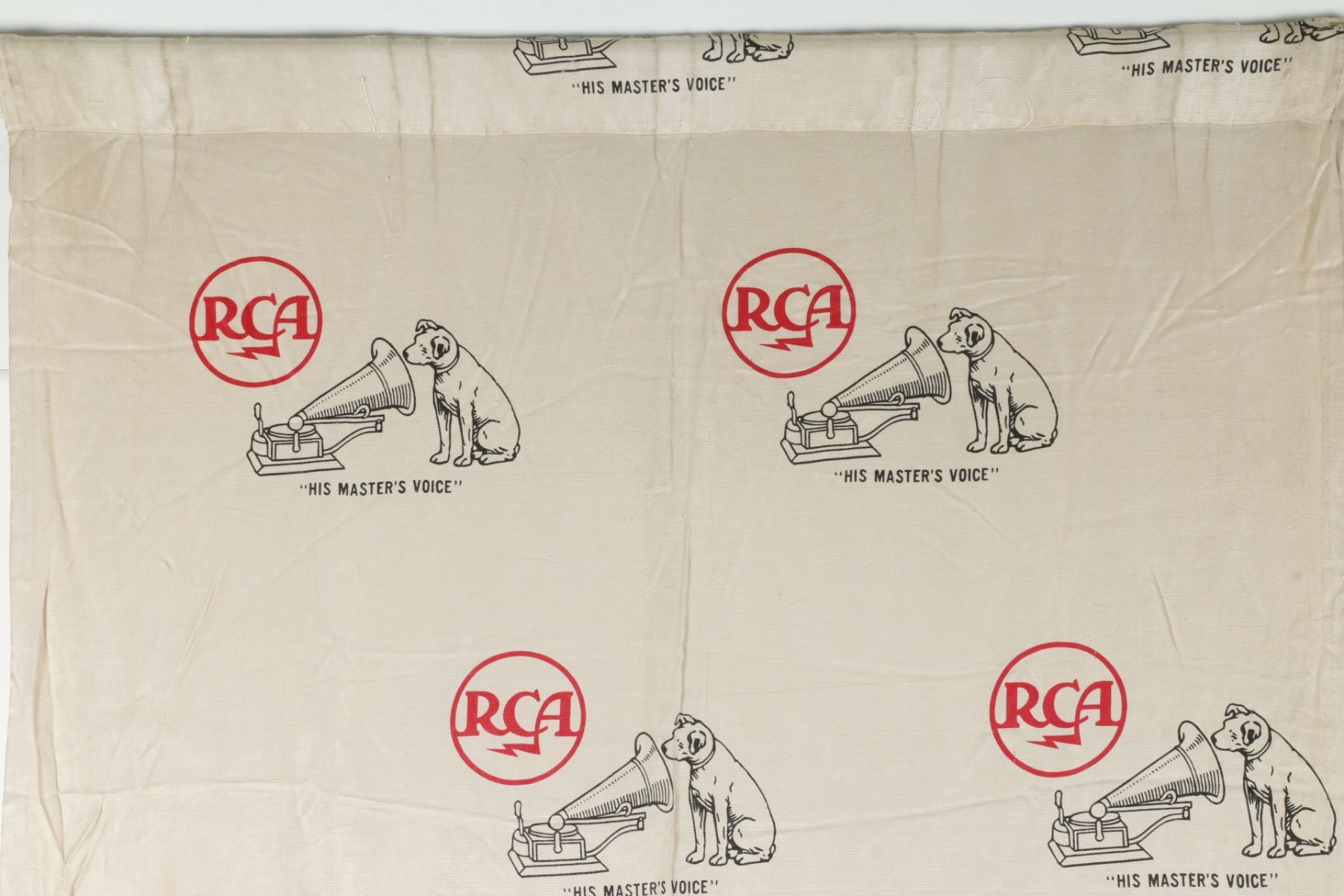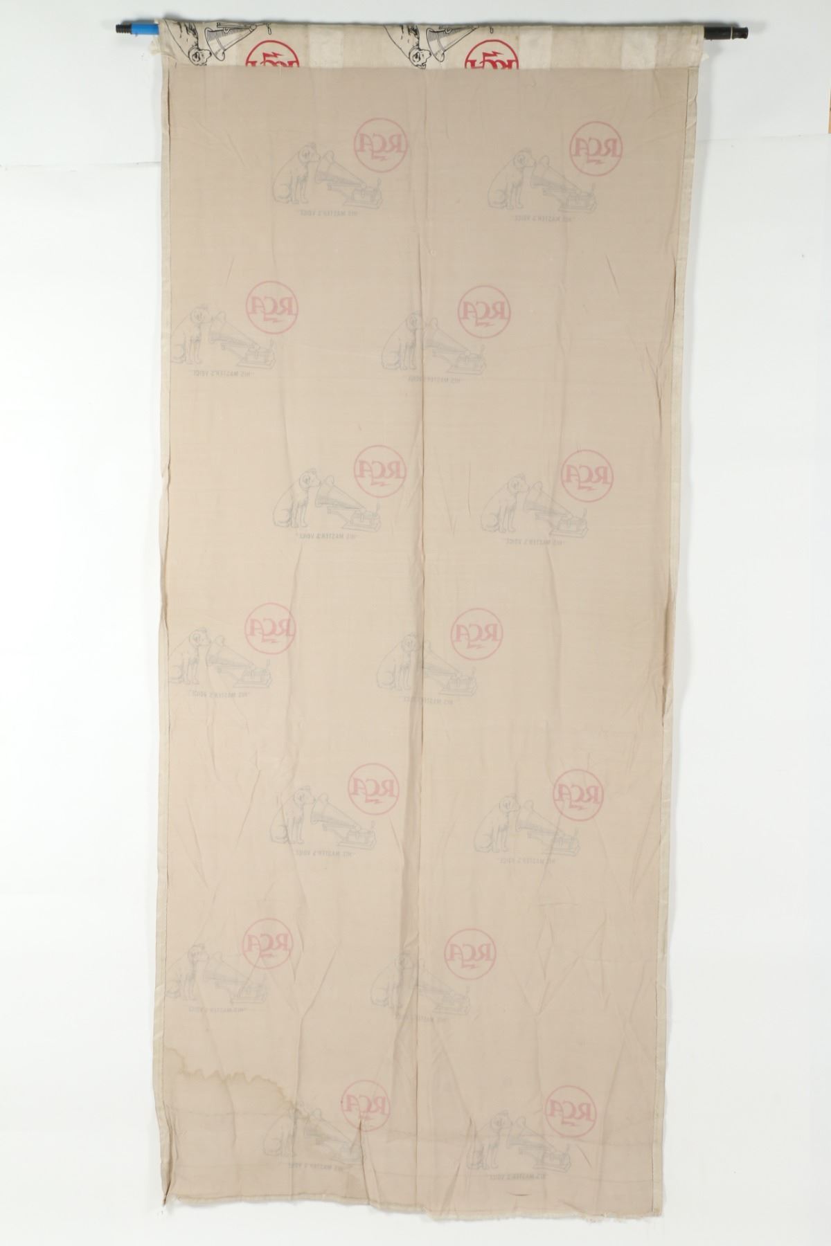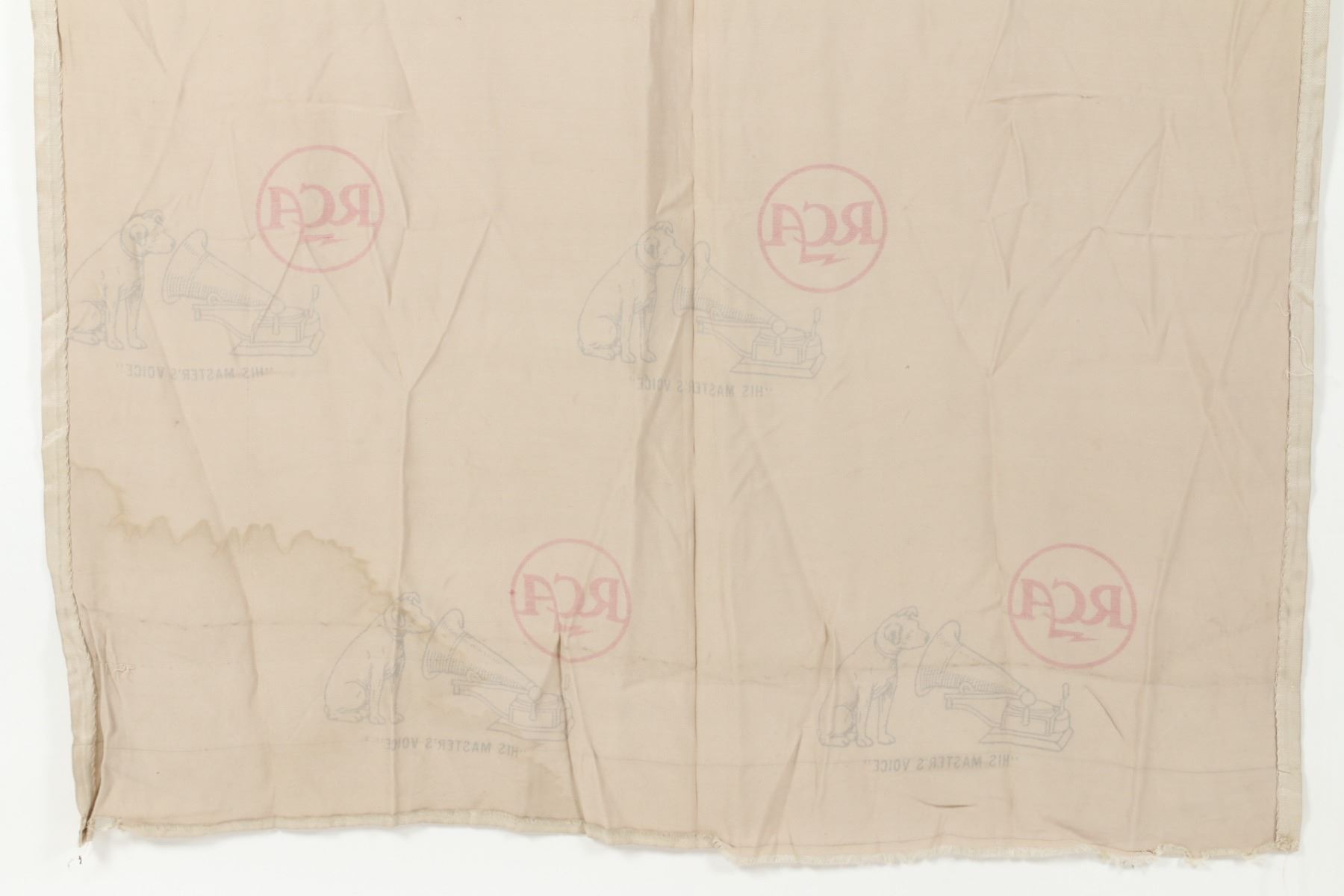 Large silk showroom backdrop featuring the famous Nipper trademark and RCA logo. 88" x 40". Soil and wear to edge of fabric. $75-100.