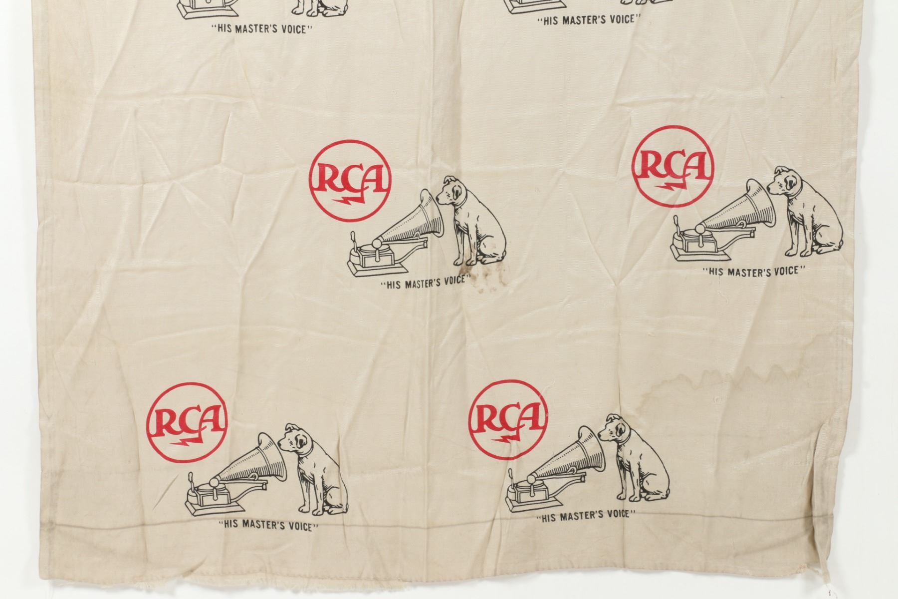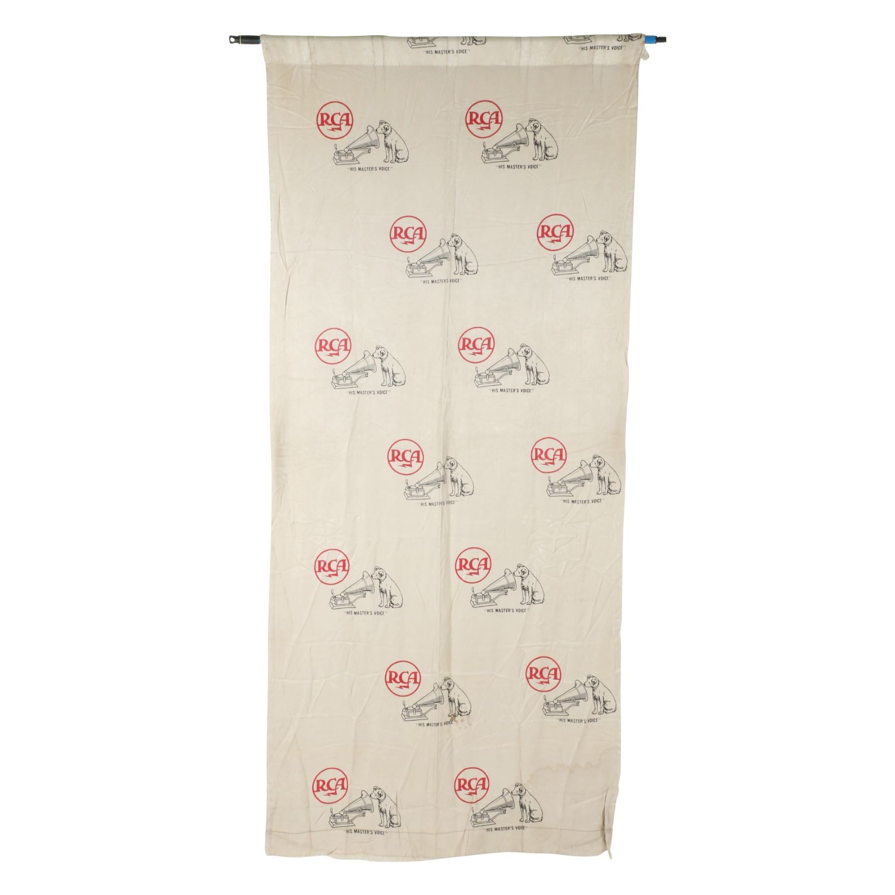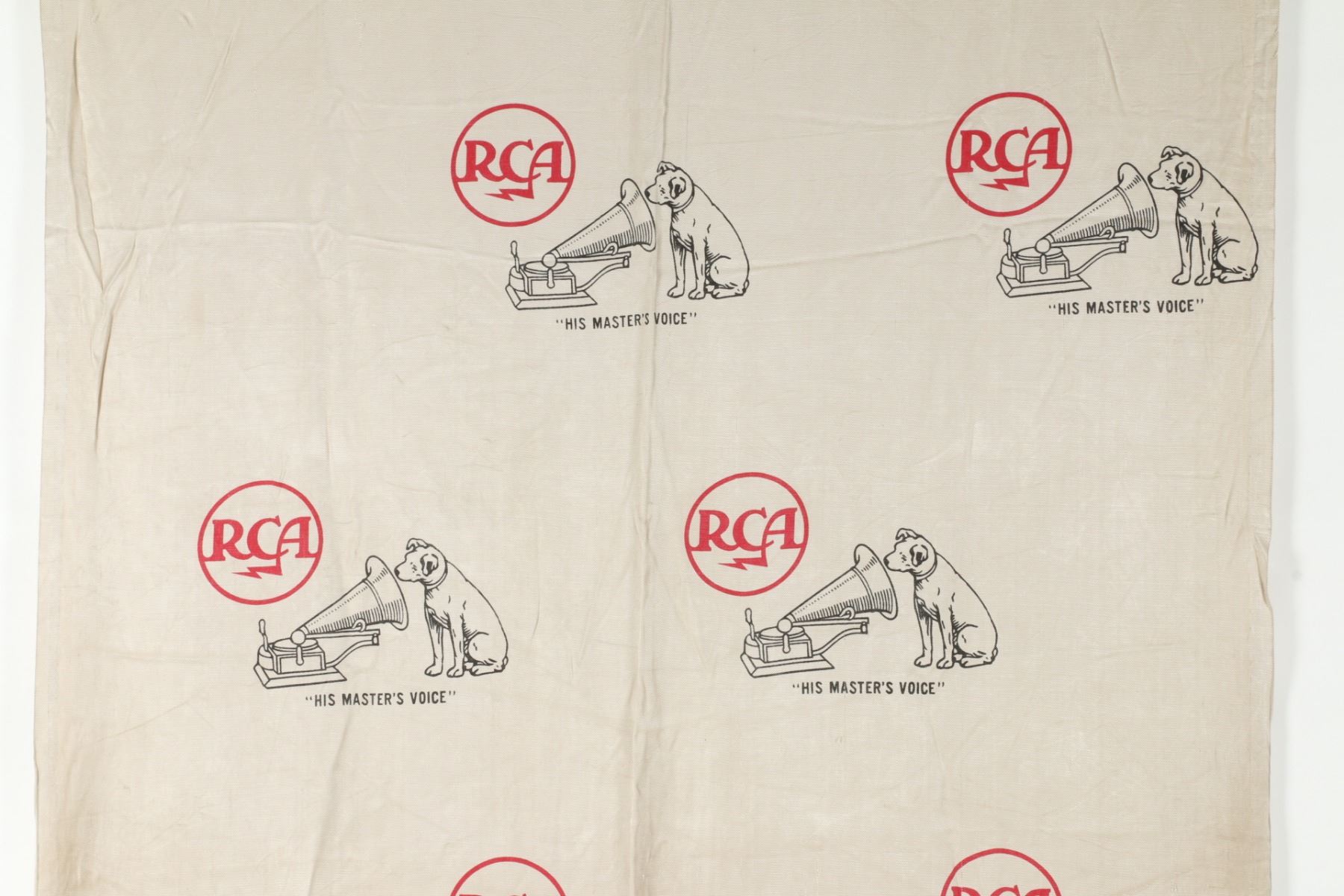 Large silk showroom backdrop featuring the famous Nipper trademark and RCA logo. 88" x 40". Soil and wear to edge of fabric. $75-100.