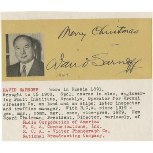 <B>RCA President David Sarnoff Signature</B></I> on card, 5.5 x 2.25, mounted on a sheet with a typed biographical sketch, signed <I>Merry Christmas - David Sarnoff</B></I>. Sarnoff (1891-1971) was a Russian immigrant who rose through the ranks of Radio Corporation of America (RCA). As a young wireless operator, Sarnoff is alleged to have monitored the signals from the liner <I>Carpathia</B></I> as she frantically steamed to rescue survivors from the <I>Titanic.</B></I> He broadcast information for 72 straight hours to newspapers and frantic family members. His early efforts paved the way for radio communication. <BR><BR><b>Shipping:</b> Flat Material, Small (<a target="_blank" href="http://www.heritageauctions.com/common/shipping.php">view shipping information</a>)