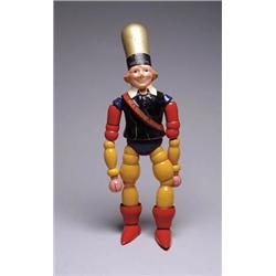 RCA RADIO ADVERTISING FIGURE. Hand painted composition body with wood jointed arms and legs. Colorfully attired in parade outfit, large figure advertises RCA "Radiotrons". SIZE: 16" t. CONDITION: Damage to nose and some grazing of body, advertising decals remain strong. 1-2551 WP