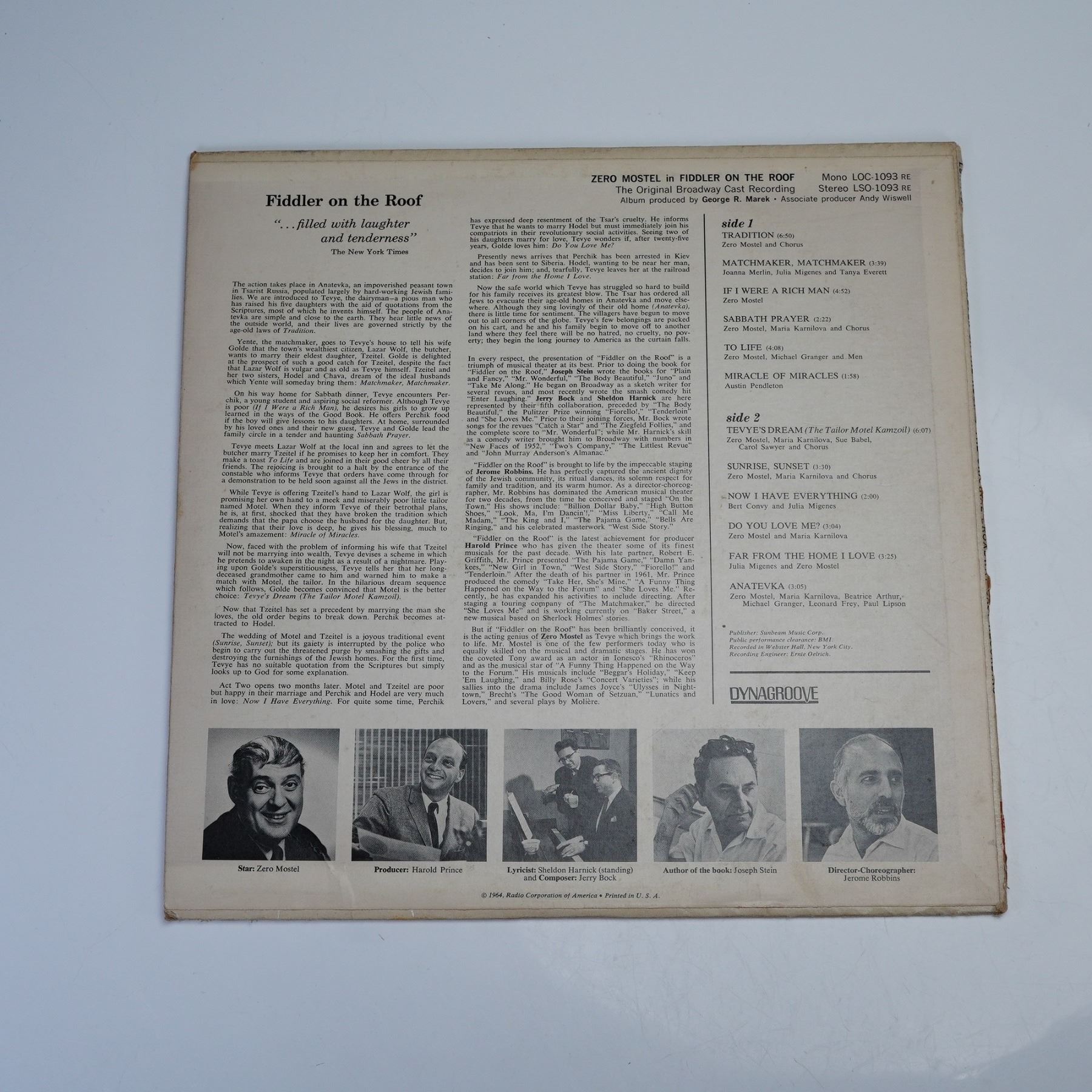 A 12-inch stereo long-playing vinyl record issued by RCA Victor records, featuring the original Broadway cast recording of Fiddler on the Roof, the acclaimed musical with music by Jerry Bock, lyrics by Sheldon Harnick, and book by Joseph Stein. This production, presented by Harold Prince and directed and choreographed by Jerome Robbins, stars Zero Mostel in the role of Tevye alongside Maria Karnilova, Beatrice Arthur, and other original cast members. The recording includes enduring numbers such as "Tradition," "Matchmaker, Matchmaker," "If I Were a Rich Man," and "Sunrise, Sunset." Pressed on RCA's "Dynagroove" series for enhanced audio fidelity, the record is housed in a colorful illustrated sleeve with full cast and production credits, along with detailed liner notes.