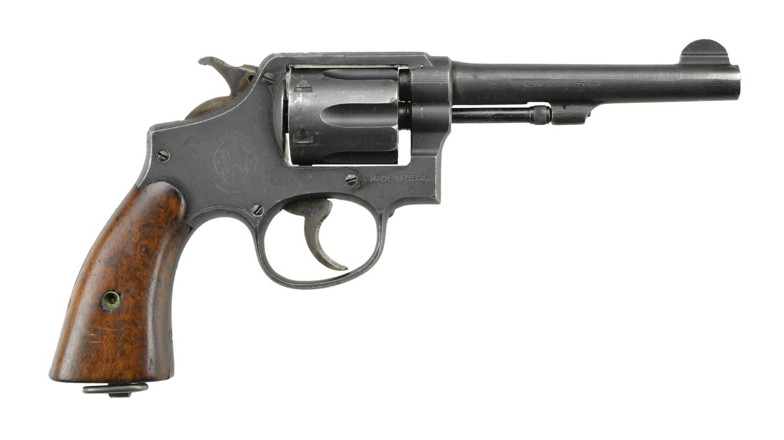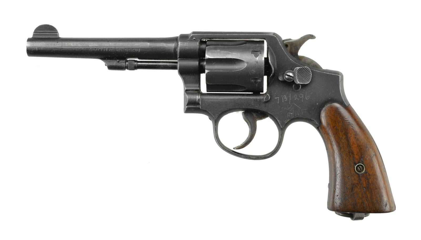 Cal. 38 S&W. S# V333771. Bbl. 5". Round blade front sight. Top strap marked w/ flaming bomb & "U.S. PROPERTY G.H.D.". Left side of frame has electro pencil number "713/296", an electro pencil broad arrow & "RCAF" marking likely for the Royal Canadian Air Force. Parkerized finish w/ case colored frame & hammer. Grip panels are mismatched but all other visible serial numbered parts are matching. Smooth walnut grips. CONDITION: grips show some dings & handling marks from the years. The trigger & hammer retain strong amounts of original case colors w/ some small oxidation stain spots & thinning. The balance of the metal retains 60% original parkerizing w/ a few small spots of light pitting on front strap & rear triggerguard, a few spots of oxidation, high edge wear & scattered thinning. Very good plus bore. (22-4416/MJC). CURIO. $300-500.