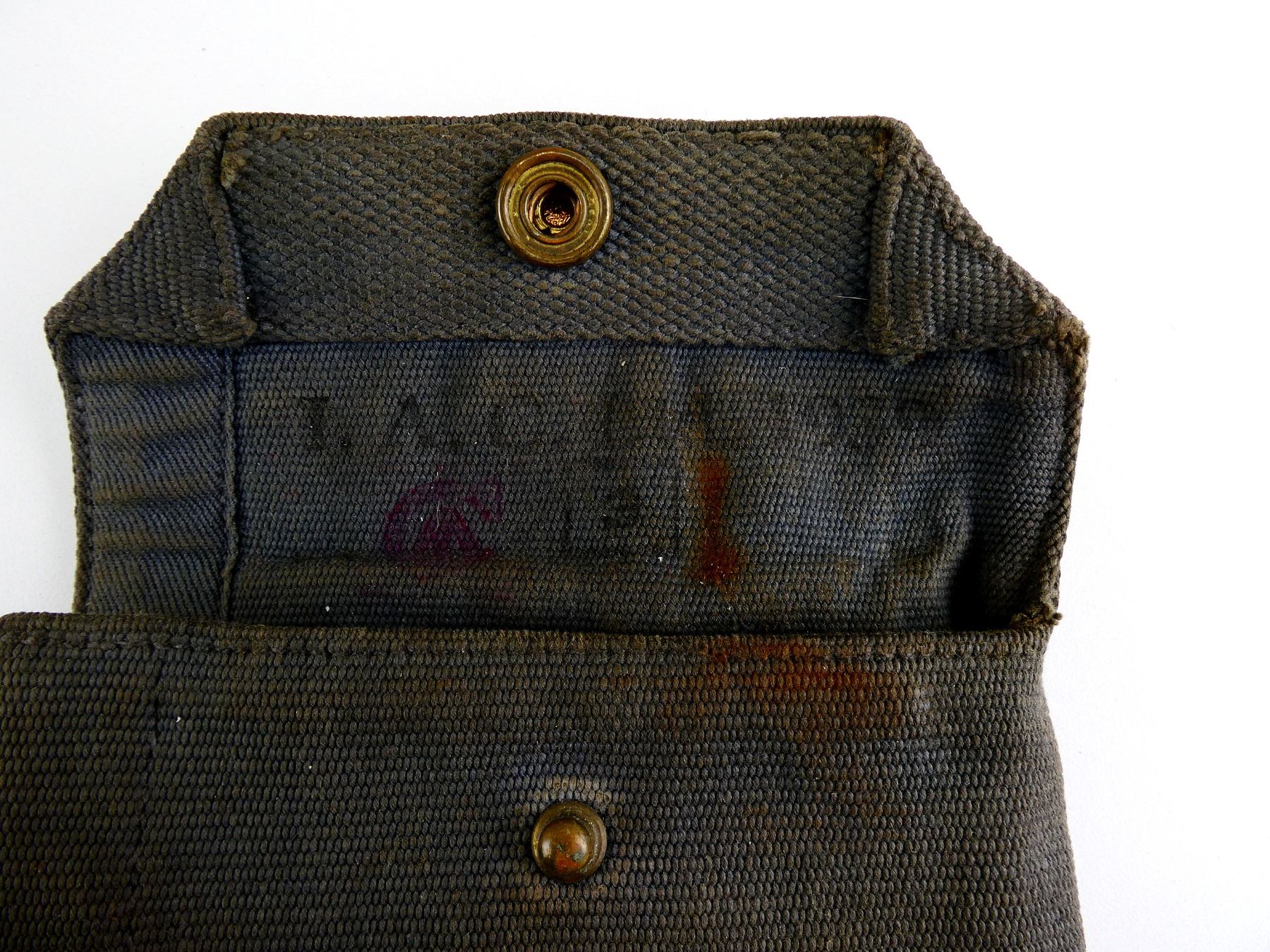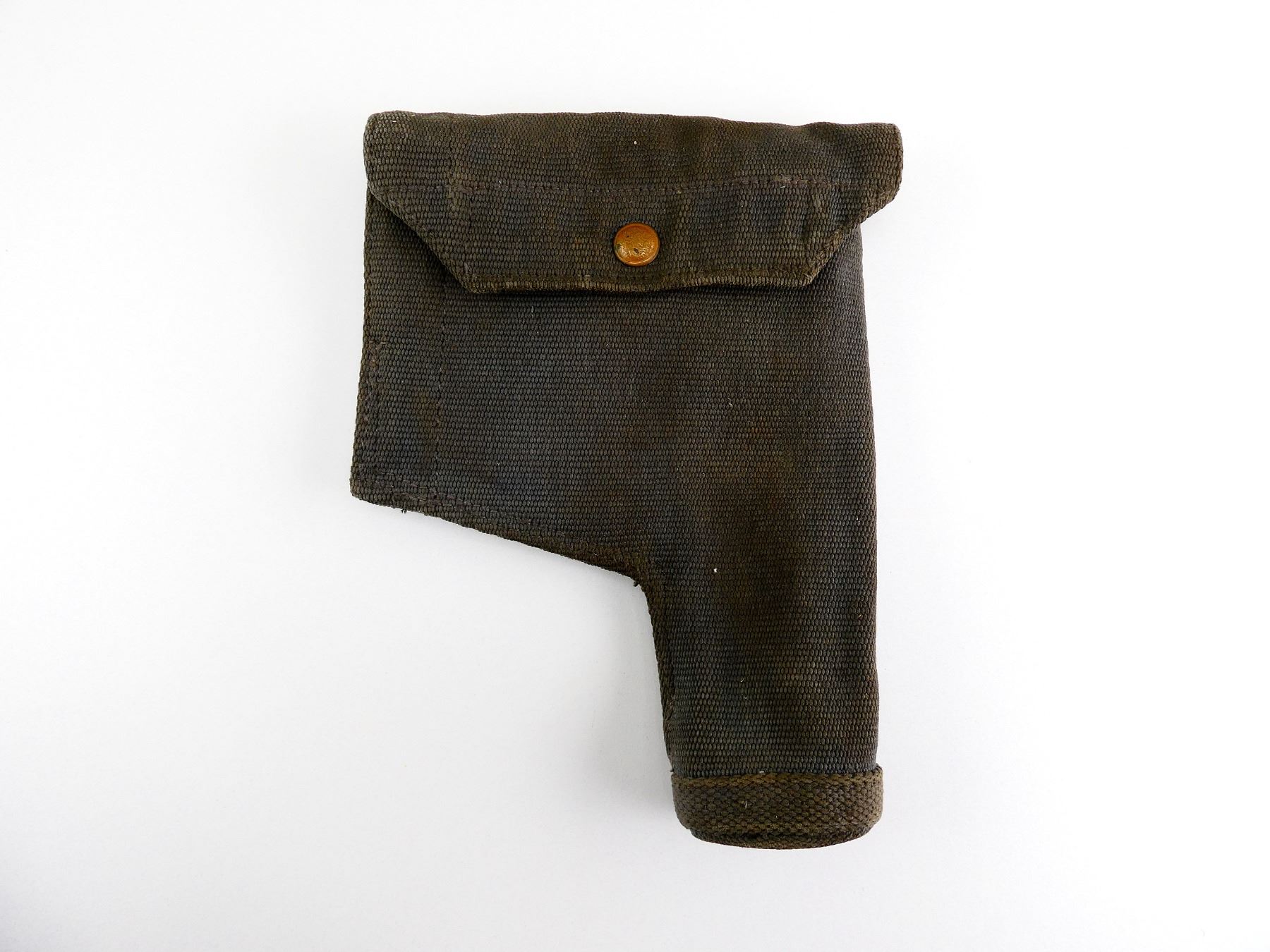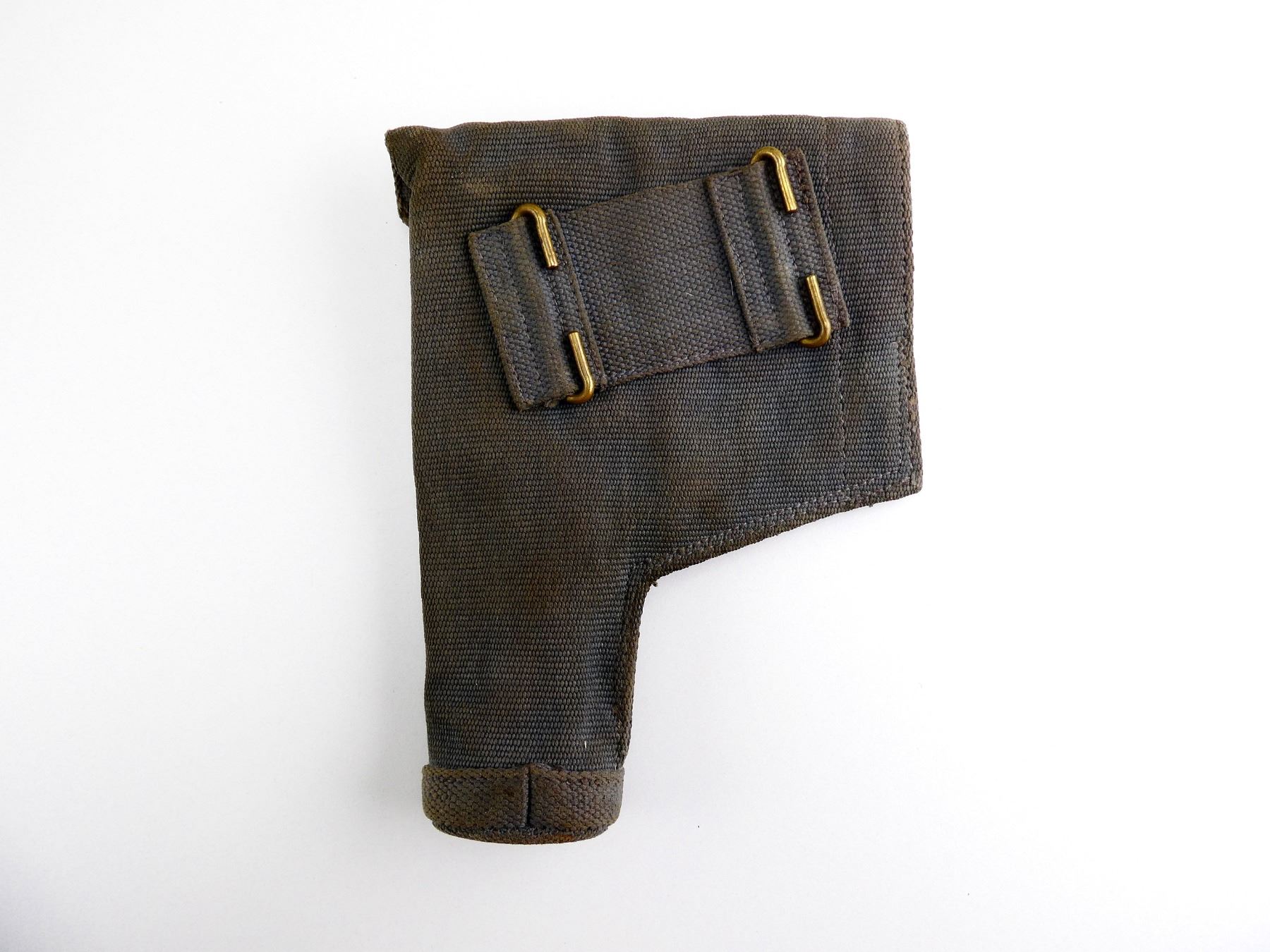 (1) BLUE P37 WEB CANVAS REVOLVER HOLSTER, MARKED: "I.A.C. L?? 1939", "3" IN A SQUARE WITH C-BROAD ARROW, BRASS FITTINGS, SHOWS AGE / WEAR. SEE PHOTOS.