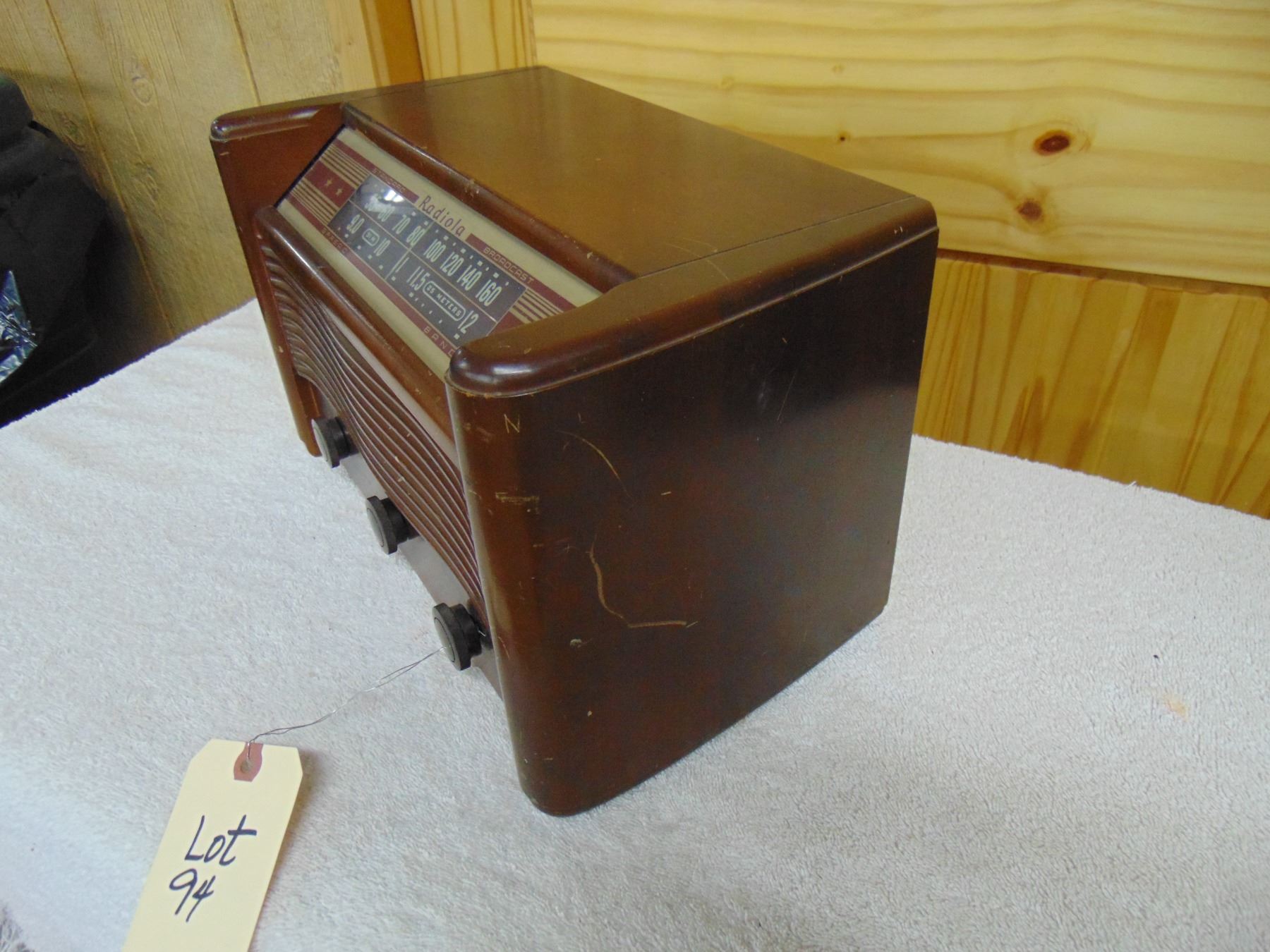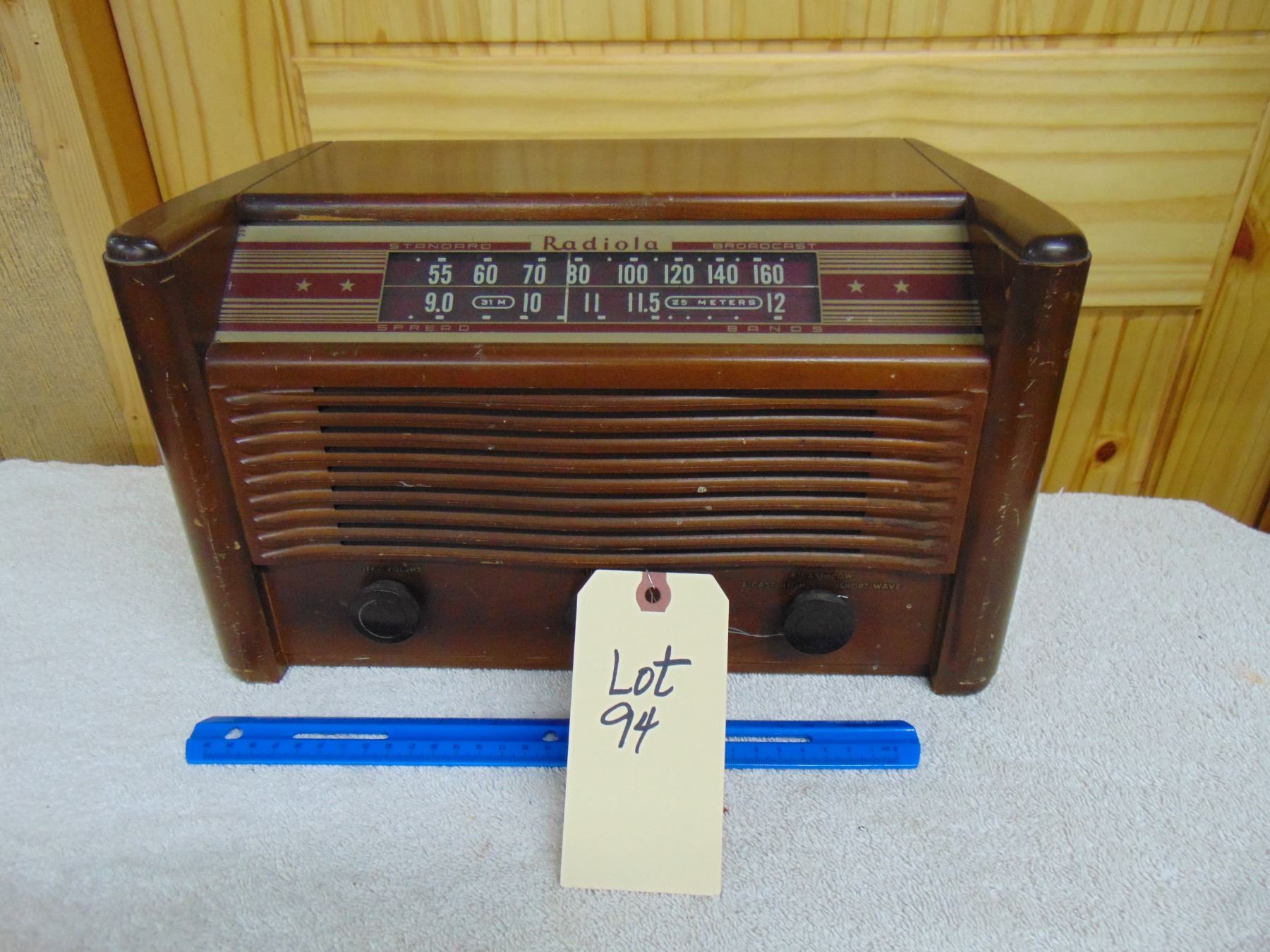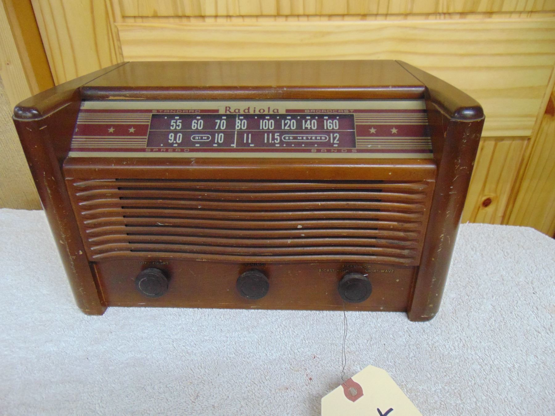 Radiola wood table radio; model 61-5; solid wood cabinet, no veneer; AM and SW; hums