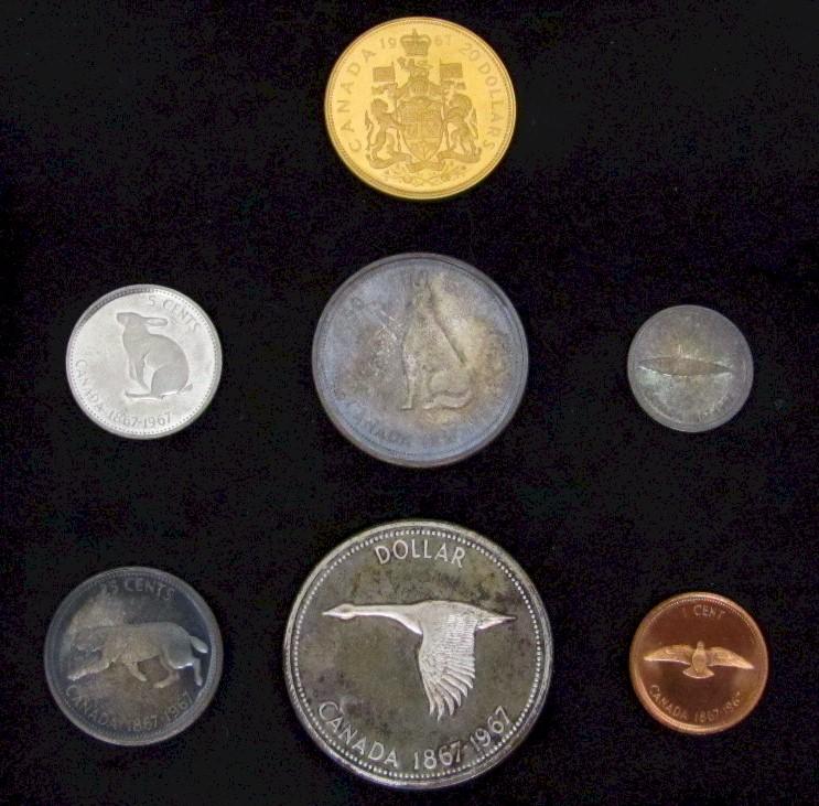 RCM 1867-1967 Commerative Coin Sets. Lot of two sets in their original black and red Cases. One set including the $20 Gold pc and the other with the Medallion. Both sets include 1¢ to $1 with the silver coins showing some nicely toned coins.