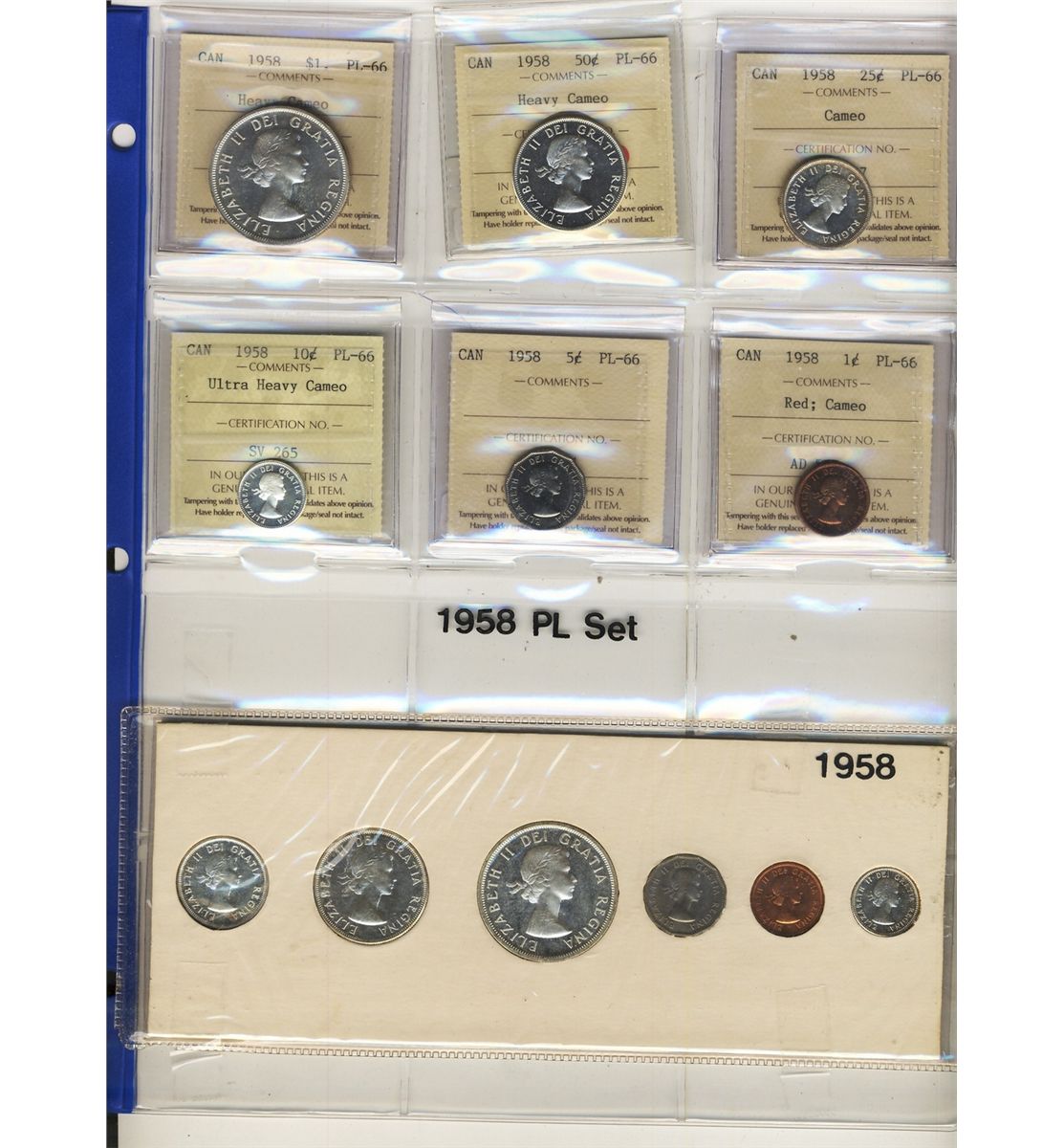 RCM, 1958 Proof Like Set. All coins ICCS graded PL66 some with Cameo to Ultra Heavy Cameo designation. Also includes Same date PL set ungraded in original cardboard holder. 2 Sets in lot.