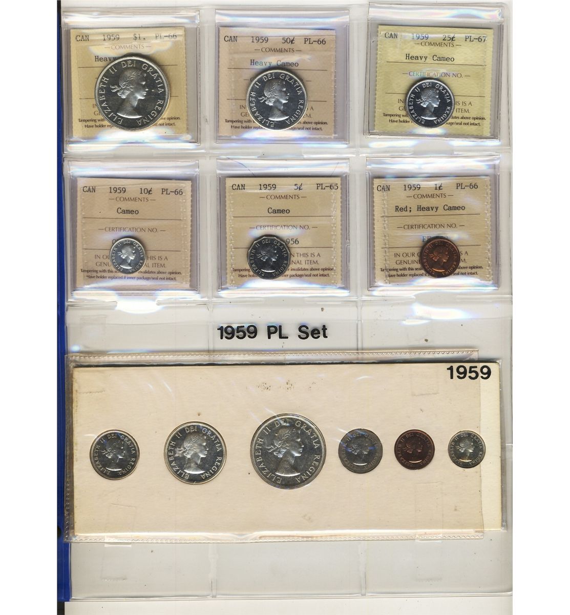 RCM, 1959 Proof Like Set. All coins ICCS graded PL66 with exception of 25¢ PL67 & 5¢ PL65. Some with Cameo to Heavy Cameo designation. Also includes Same date PL set ungraded in original cardboard holder. 2 Sets in lot.