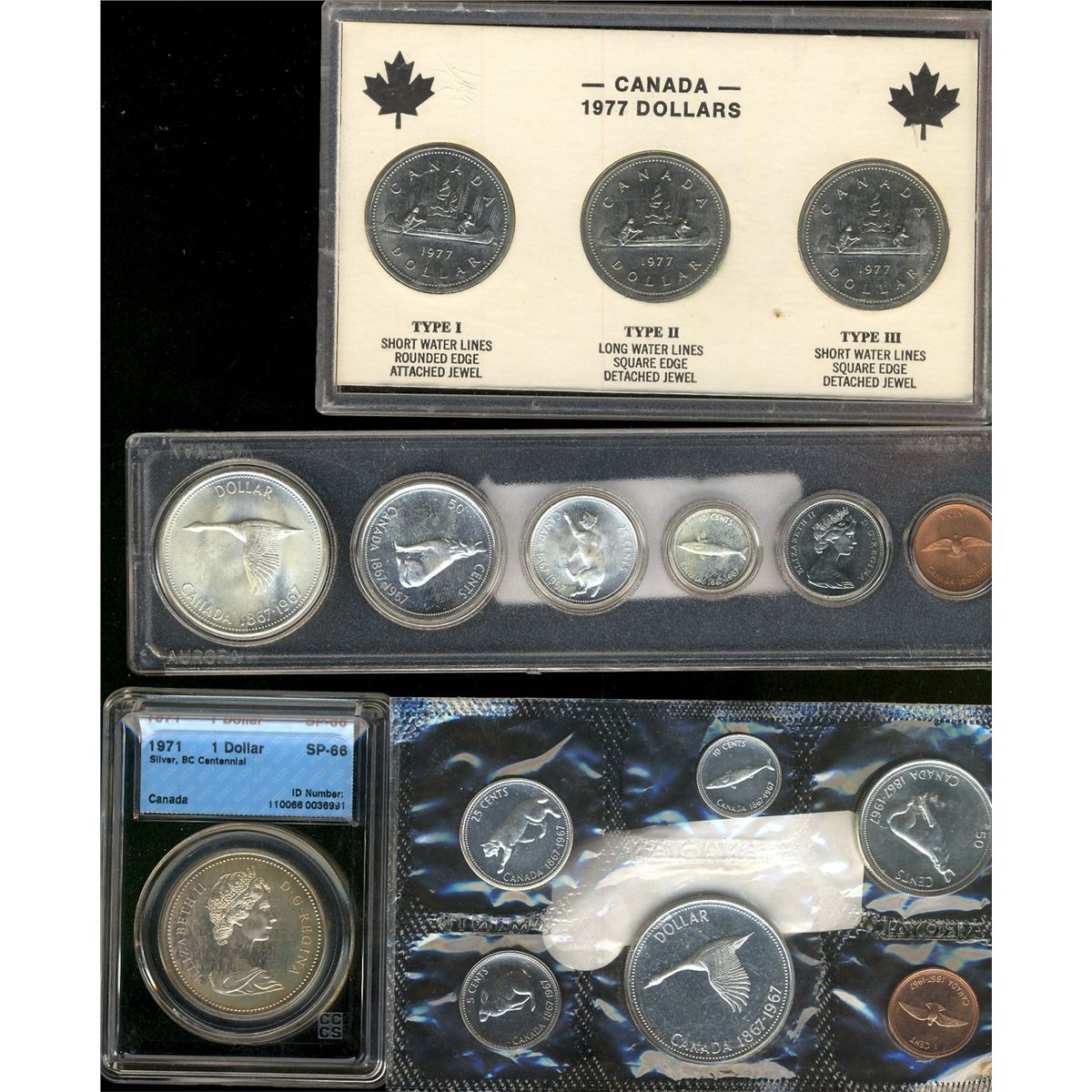 RCM; 1971 $1 CCCS SP66, 1967 PL Set, 1967 Year set & 1977 Nickel Dollar set with Type I, II & III in
