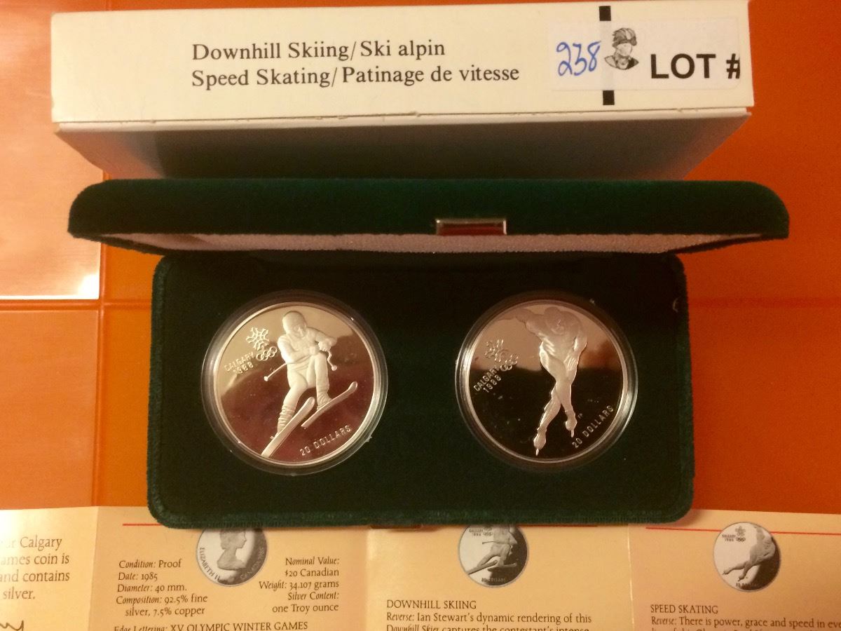 RCM: 1986 $20 Proof XV Olympic Winter Games, Set of Two Sterling Coin. Downhill Skiing & Speed Skating