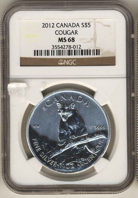 RCM, 2012 $5 Proof Silver Cougar NGC MS68.
