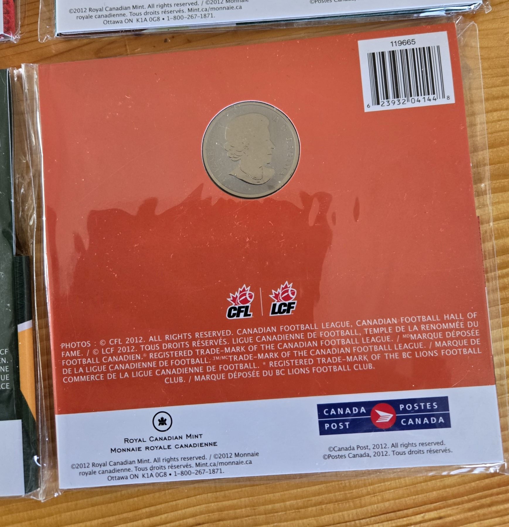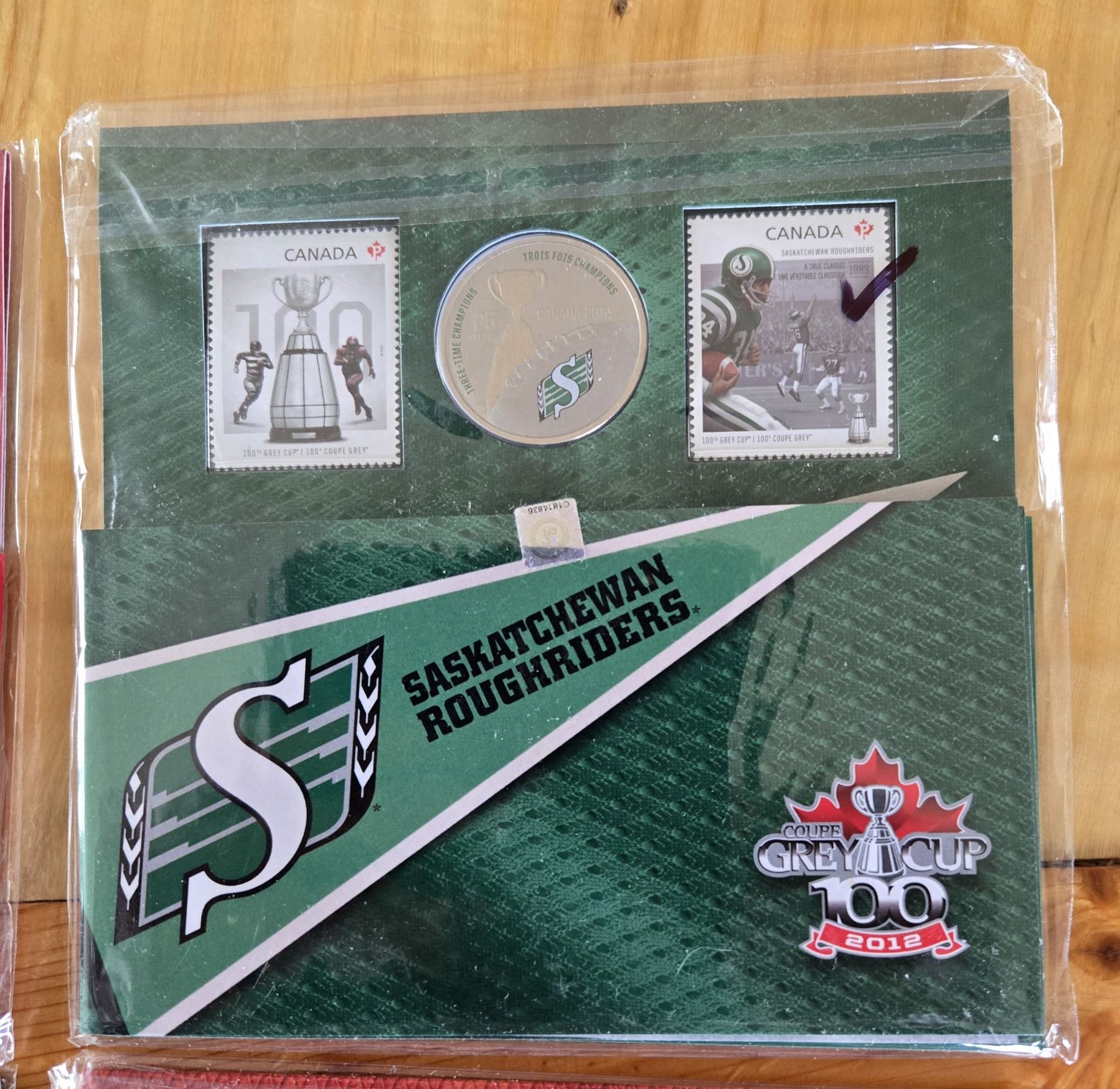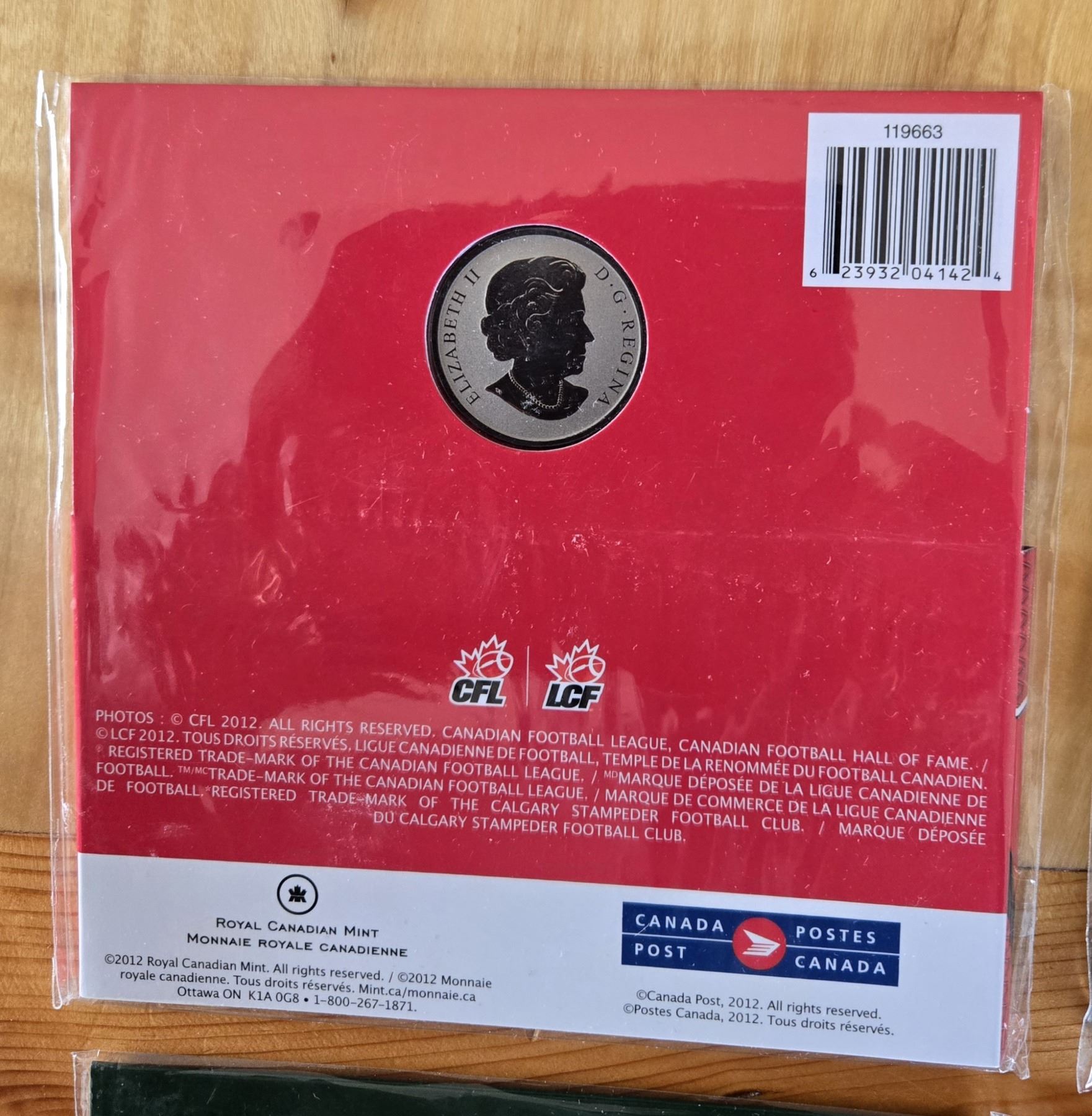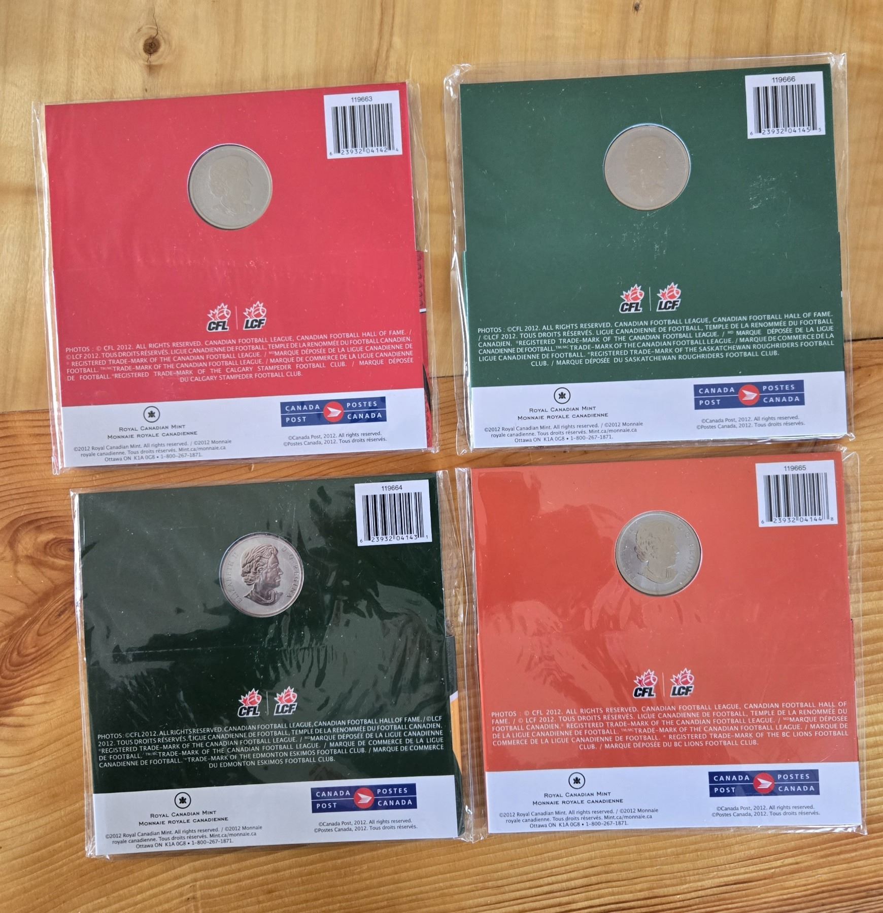 RCM 2012 CFL Commemorative Coins & Stamps. Western Division. Collection includes Saskatchewan Roughriders, BC Loins, Edmonton Eskimos, and Calgary Stampeders.