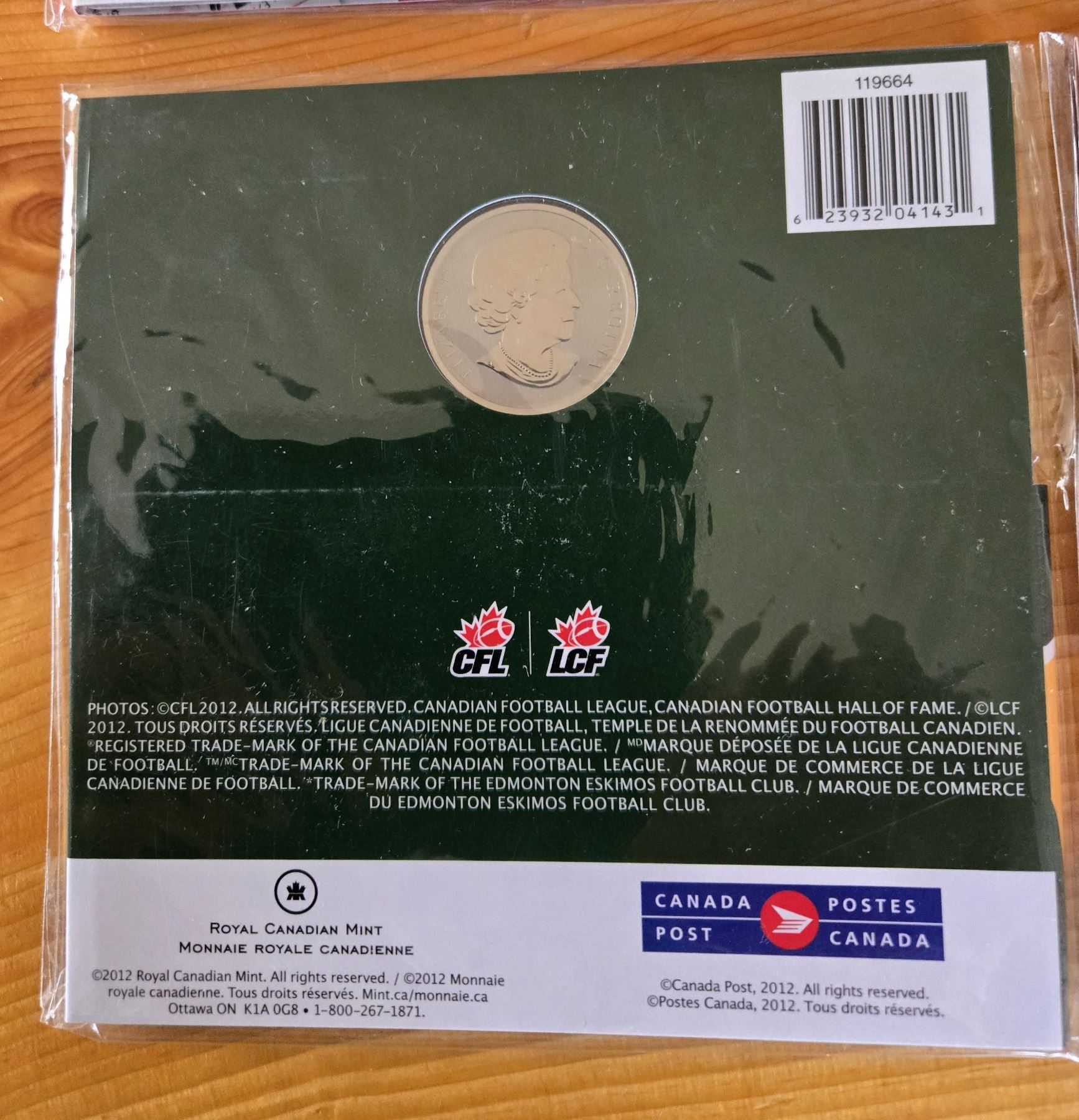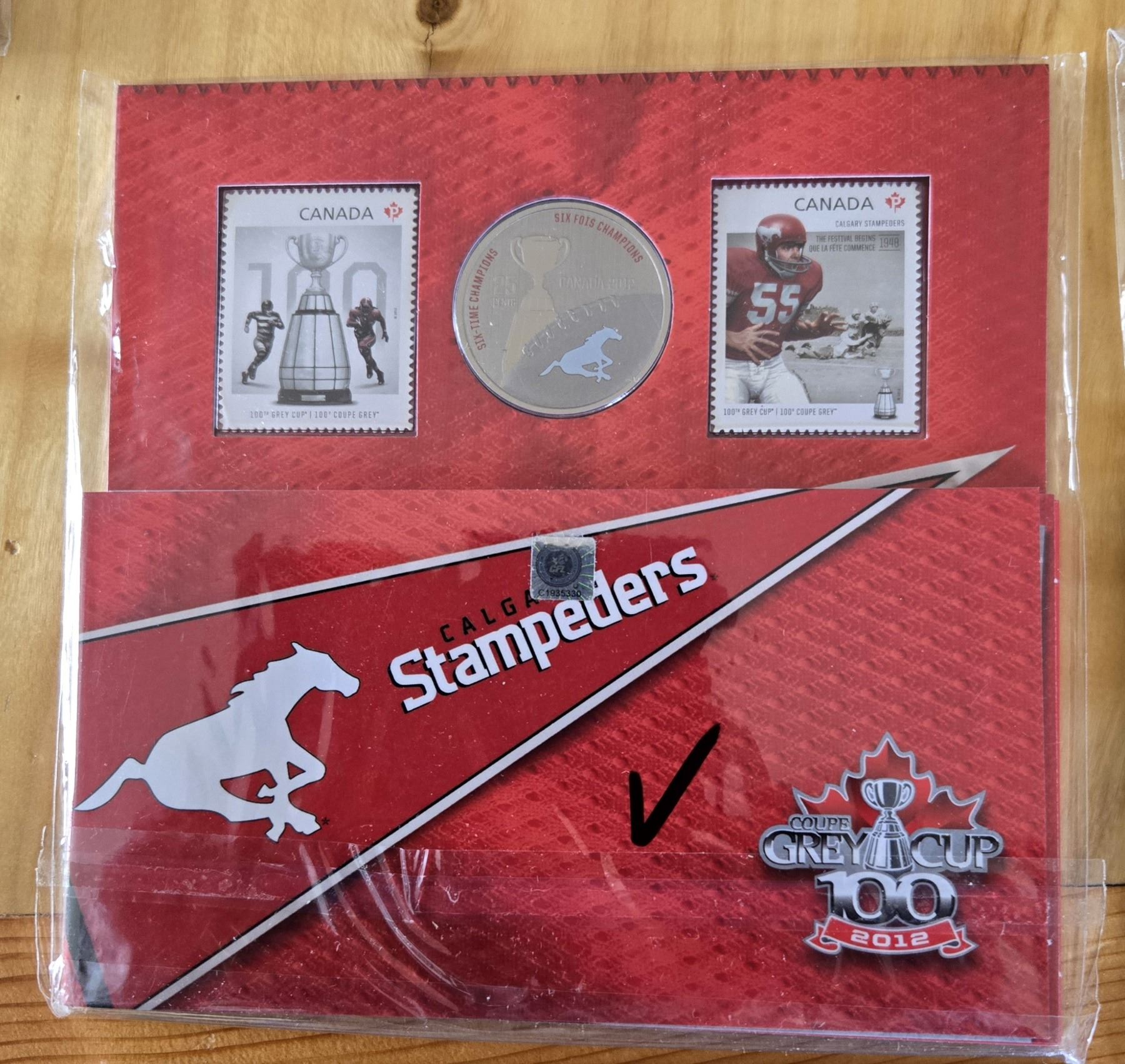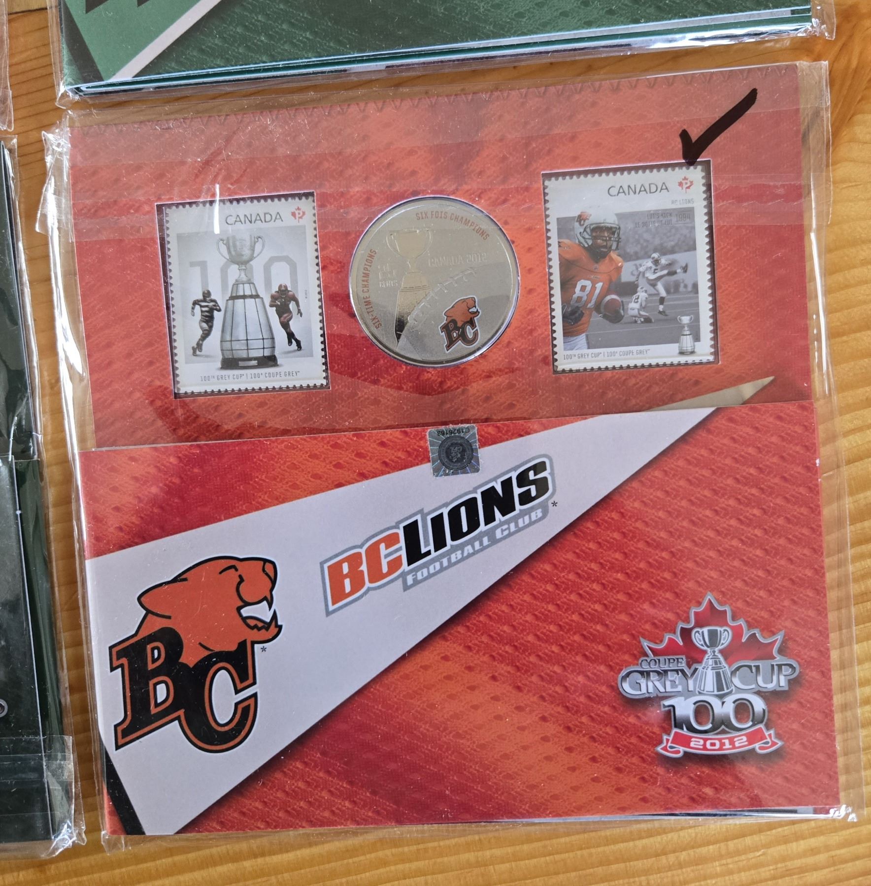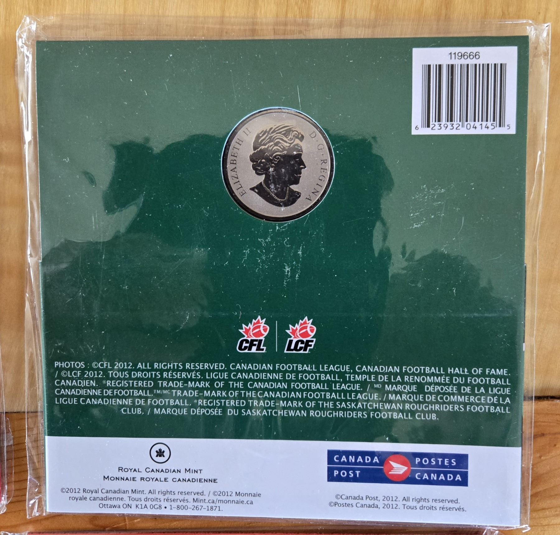 RCM 2012 CFL Commemorative Coins & Stamps. Western Division. Collection includes Saskatchewan Roughriders, BC Loins, Edmonton Eskimos, and Calgary Stampeders.