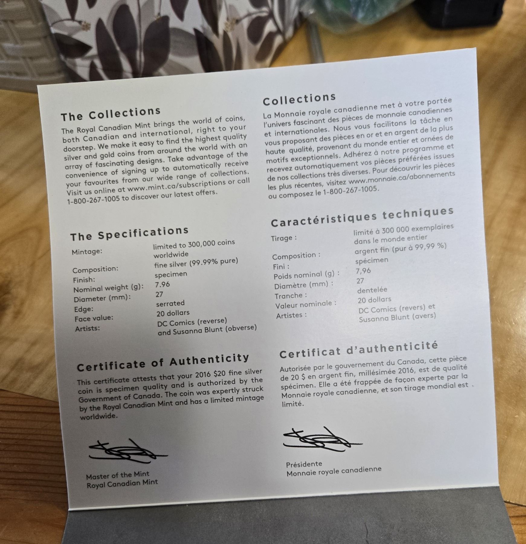 RCM 2016 Fine Silver “Batman Verses Superman” Coin. Unopened and uncirculated.