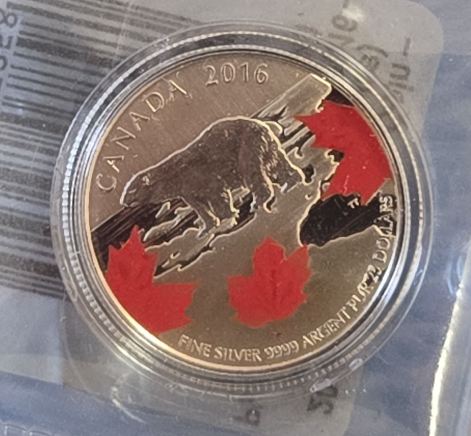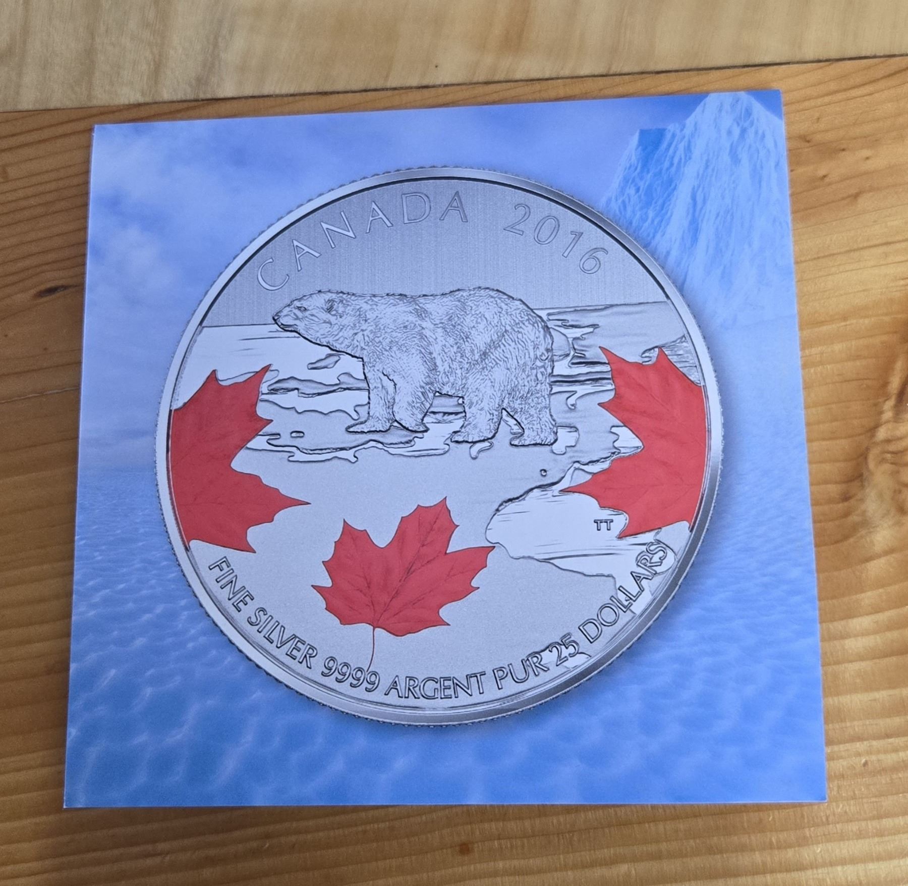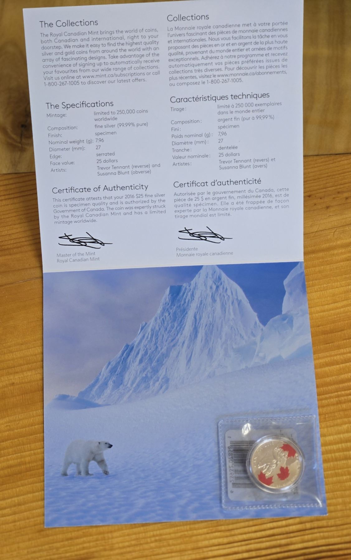 RCM 2016 Fine Silver Coin with maple leaf and polar bear design. Unopened and uncirculated.