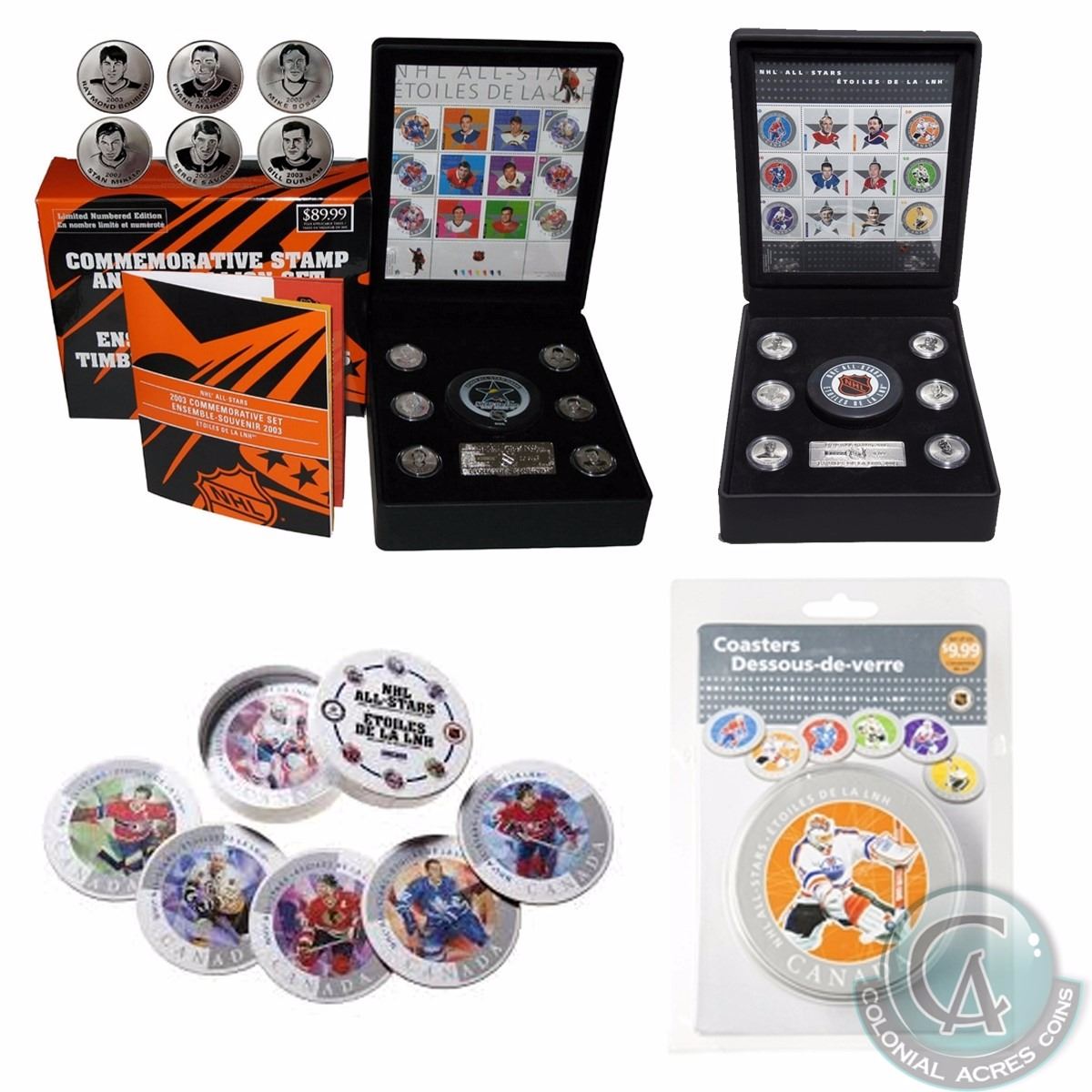 These deluxe set includes six legendary players Medallion depicting a portrait all of six players for each year. The sets also includes a Commemorative stamp for each player, an official all stars game puck, a premium booklet with career stats and biography of each player, an official NHL Alumni pin and a sleek custom leatherette display box.