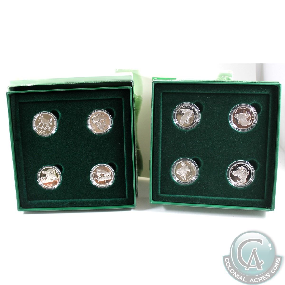 RCM ISSUE: 1996 Little wild ones & 1997 Dogs of Canada Sterling Silver 50-cent 4-coin sets. Sets comes with all original mint packaging, however some coins are lightly toned.