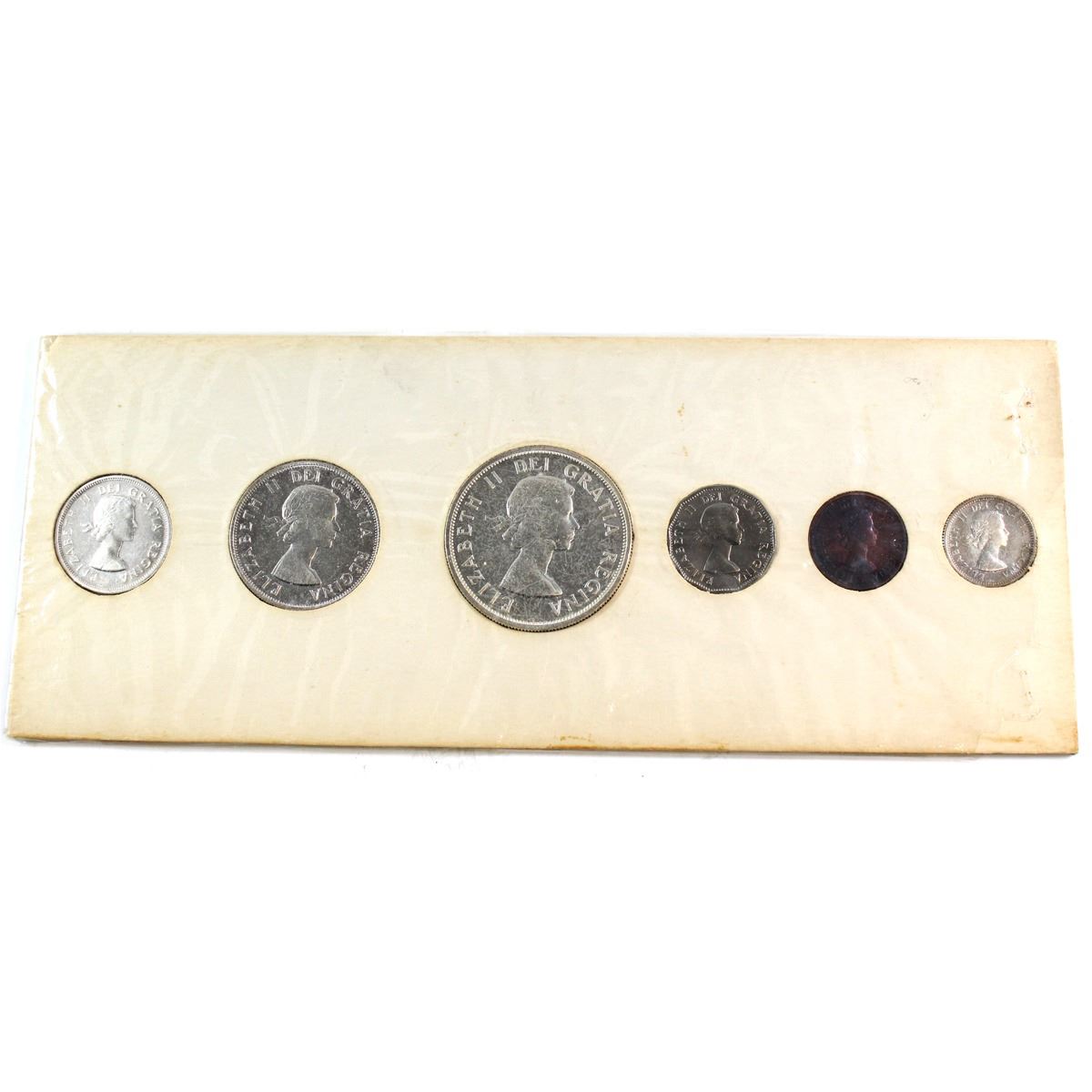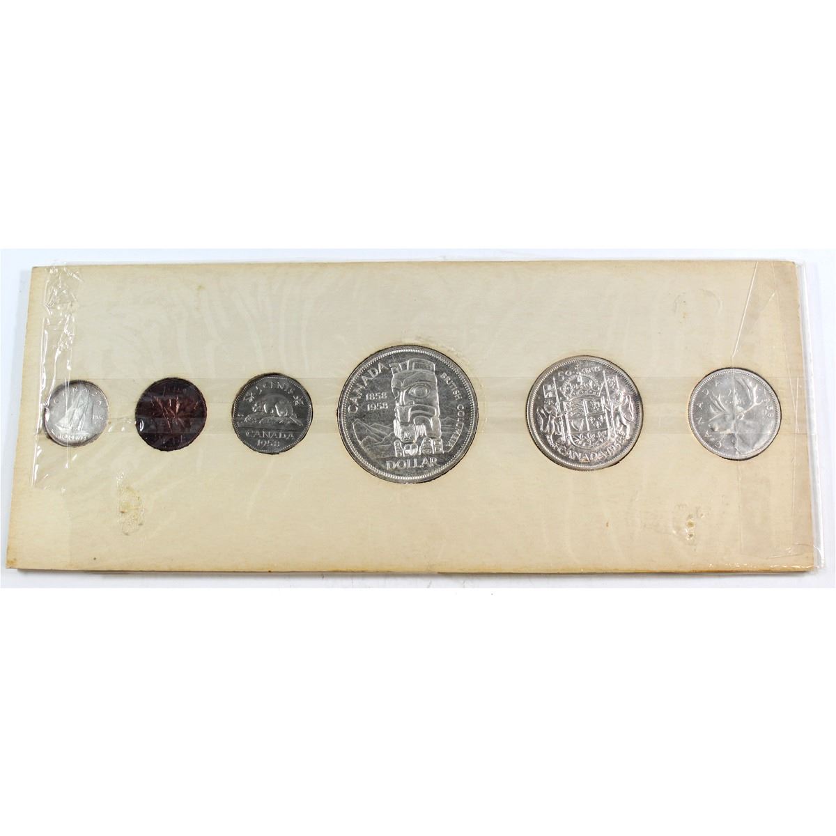 RCM Issue: 1958 Canada Proof-like Set in Original White Cardboard. Coins are lightly toned, with the exception of the 1-cent coin which contains a deep purple and blue hue toning throughout the Obverse and Reverse of the coin.