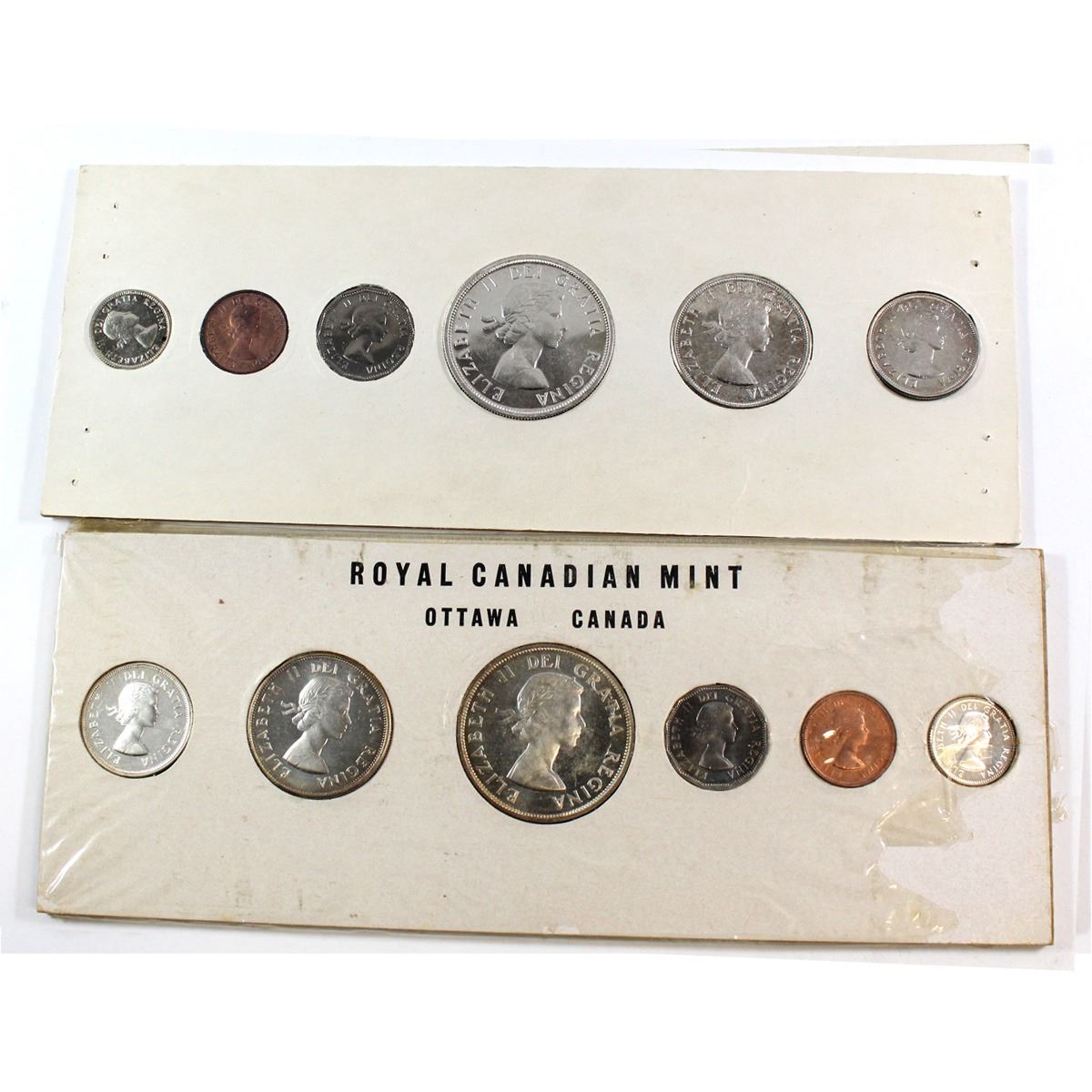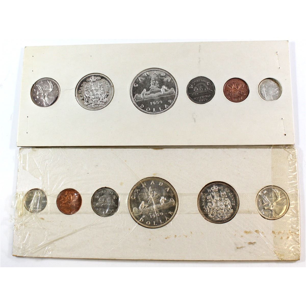 RCM Issue: 1959 & 1960 Canada Proof-like Set in Original White Cardboard. 1960 coins are accented with a light Cameo relief and light rim toning on the Obverse and Reverse of the coins. 2 sets