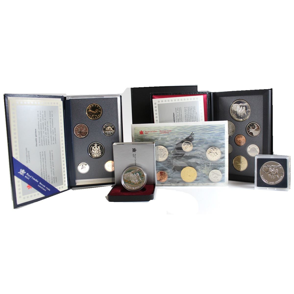 RCM Issue: 1992 Canada RCM Estate Lot. You will receive the following items Issued in 1992; Specimen 6-coin Set, Uncirculated Proof Like Set, Proof Double Dollar set, Proof Dollar, and BU Dollar. All items come in original mint Issue packaging. Please note coins may have toning and some plastic holders have light scratches. 5pcs.