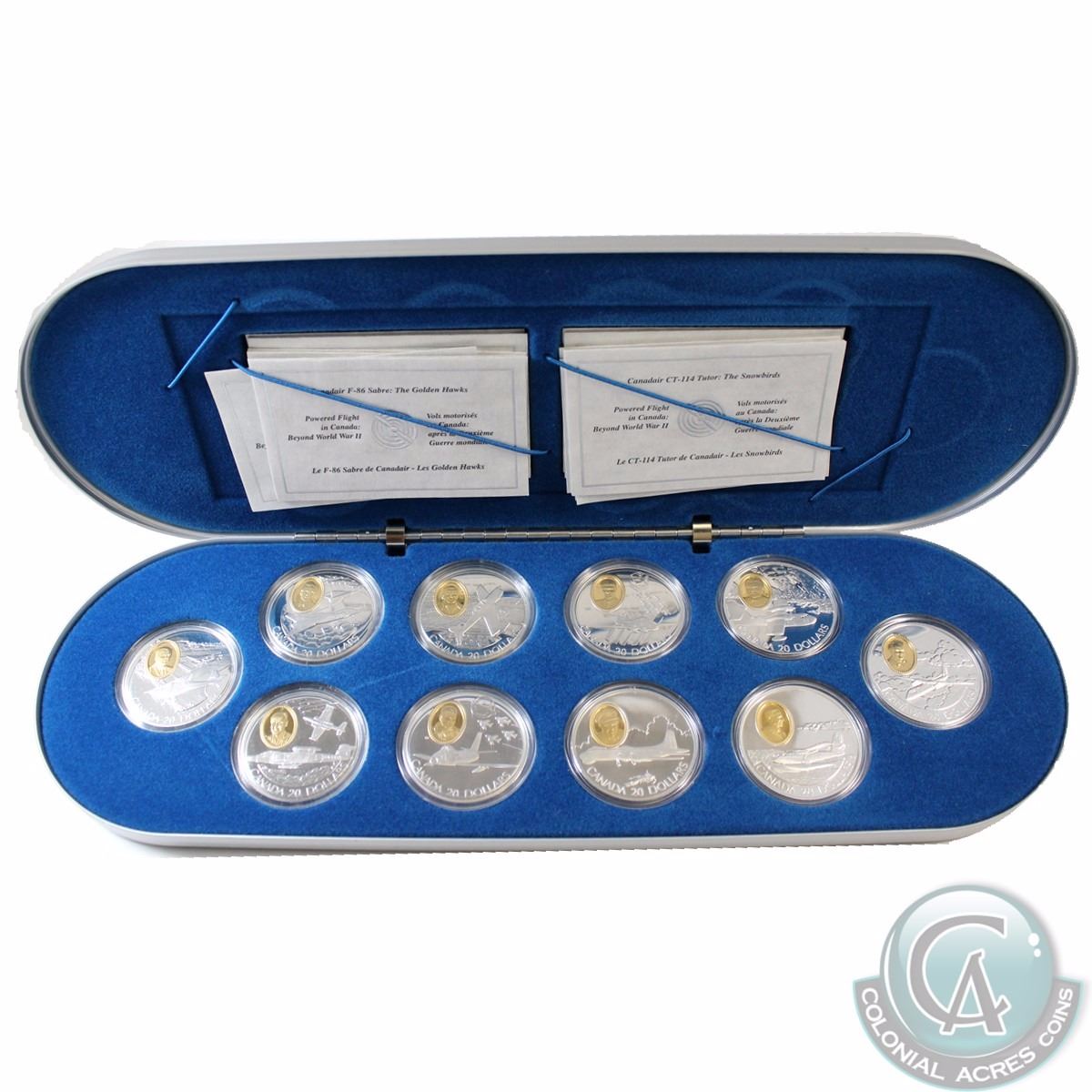 RCM Issue: 1995-1999 Canada Aviation Complete Sterling Silver Set 10-coin Set #2 in Deluxe Display Case (Missing outer cardboard sleeve & some capsules are scratched)