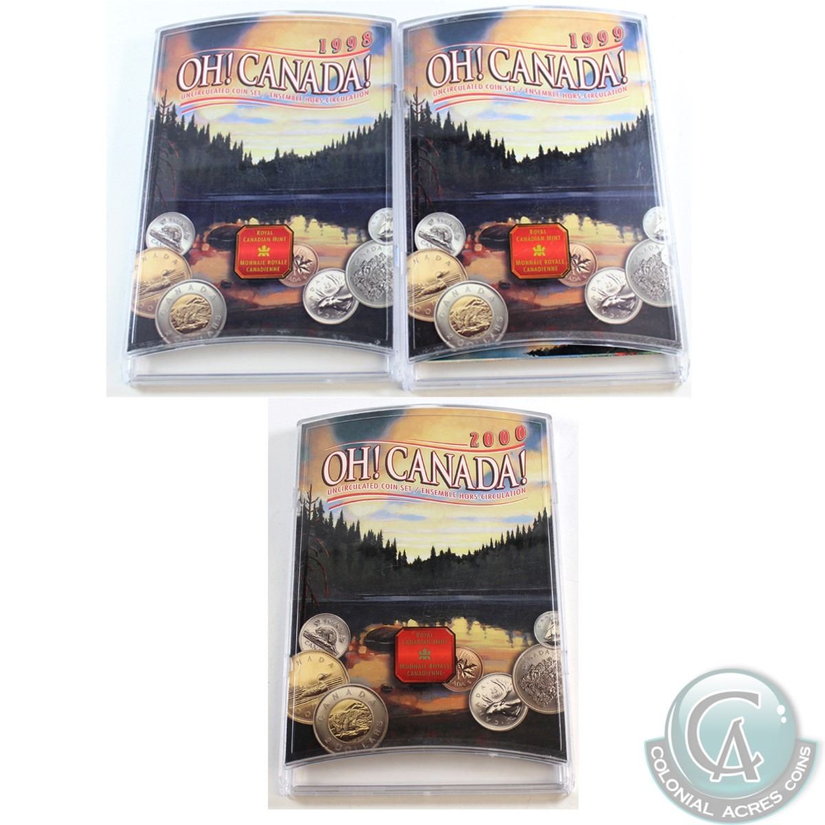 RCM Issue: 1998, 1999 & 2000 Oh Canada 7-coin Uncirculated sets. The outer hard plastic is scuffed however the coins are fine. 3 sets