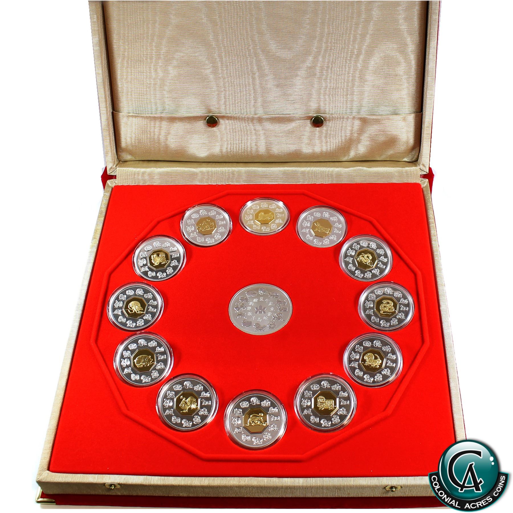 RCM Issue: 1998-2009 Canada $15 Sterling Silver Gold Plated Lunar coin Collection in Red Velvet Display Box. You will receive the 1998 Tiger, 1999 Rabbit, 2000 Dragon, 2001 Snake, 2002 Horse, 2003 Sheep, 2004 Monkey, 2005 Rooster, 2006 Dog, 2007 Pig, 2008 Rat and the 2009 Ox (capsules may be scratched and/or coins lightly toned & COAs and outer sleeve missing).