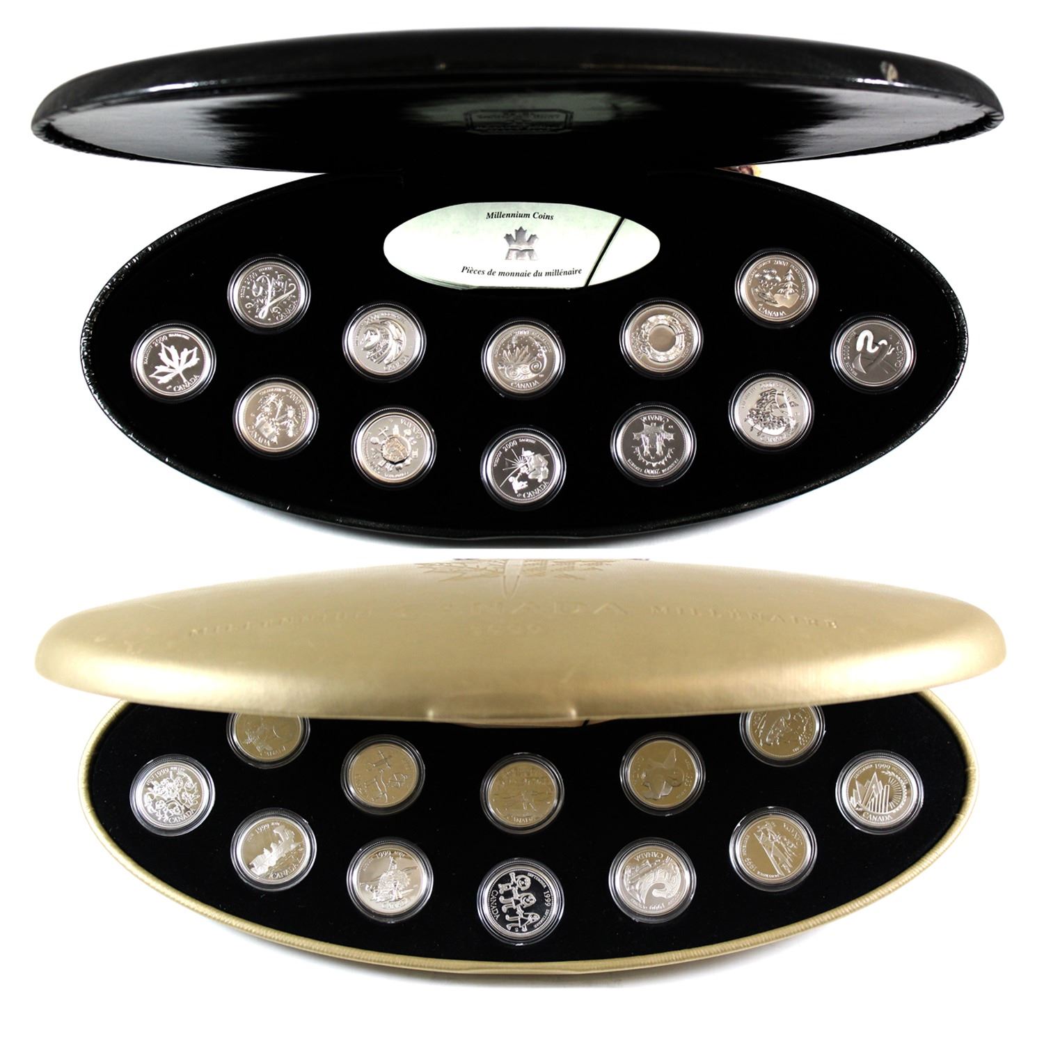 RCM Issue; 1999 & 2000 Millennium 25-cent Proof Sterling Silver Sets. Coins come encapsulated with certificate and clamshell (clamshell is scuffed). 2pcs.