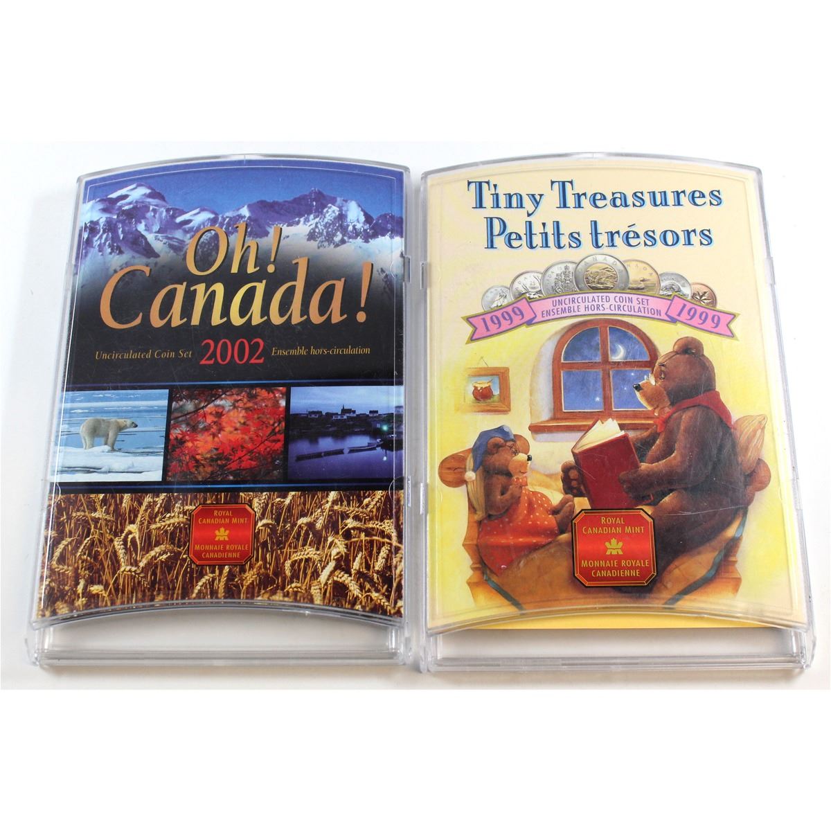 RCM Issue: 1999 Tiny Treasures & 2002 Oh Canada 7-coin Uncirculated Sets (outer hard plastic is scuffed and contains hairline cracks). 2 sets