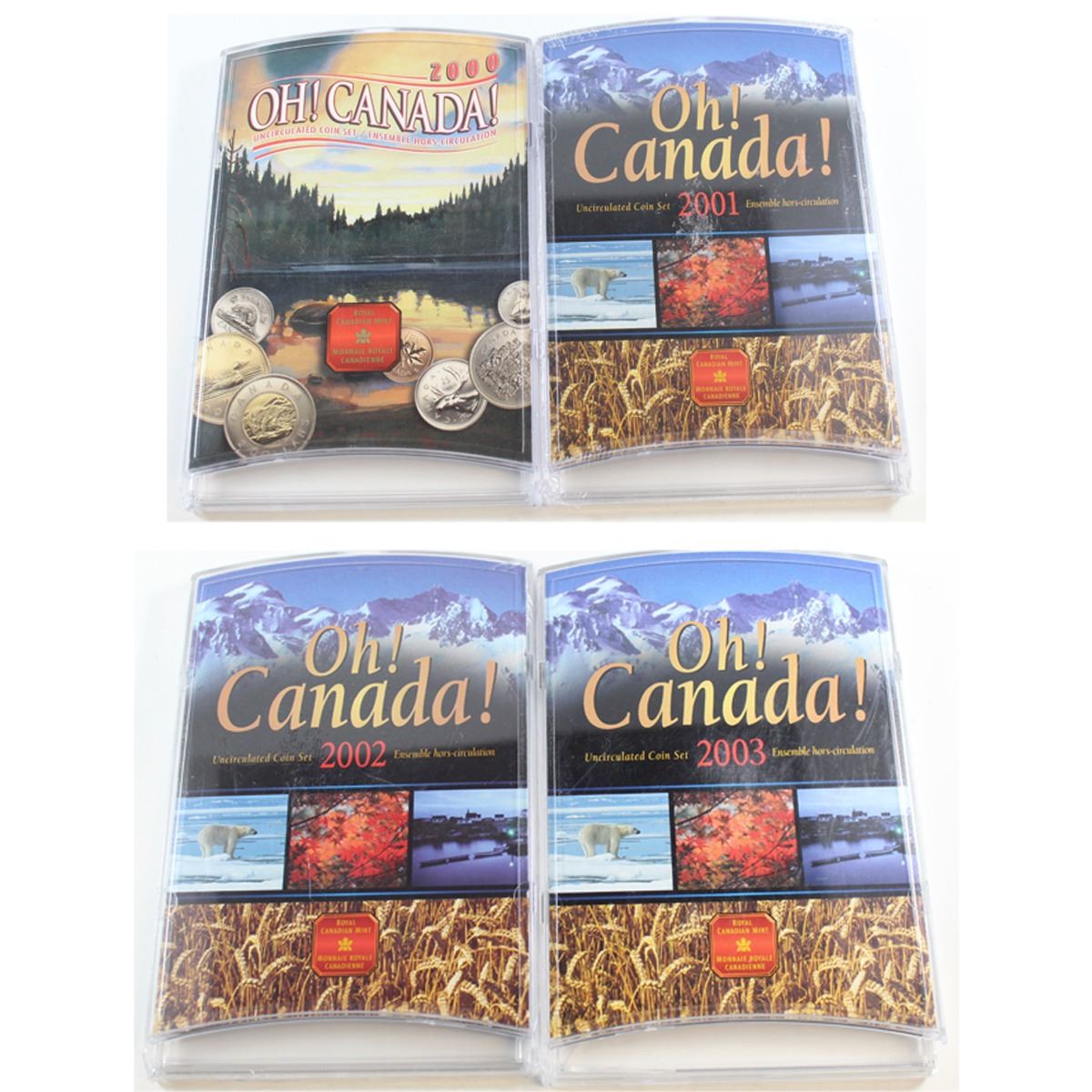 RCM Issue: 2000, 2001, 2002 & 2003 Oh Canada 7-coin Uncirculated sets. These sets come with all original mint packaging (holders are scuffed and the 2003 hinge is broken). 4 sets