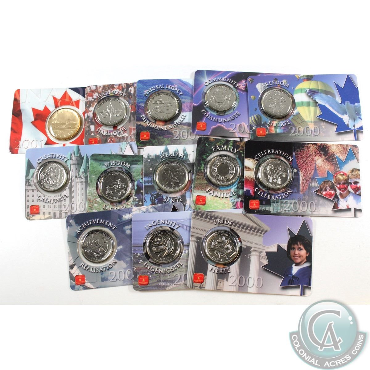 RCM Issue: 2000-2001 Canada 25-cent and Loon Collector Card Lot Issued by the Royal Canadian Mint. You will receive the following Coins: 2000 Pride, Ingenuity, Achievement, Celebration, Family, Health, Harmony, Natural Legacy, Community, Freedom, Creativity, Wisdom, and 2001 Loon. 12pcs.