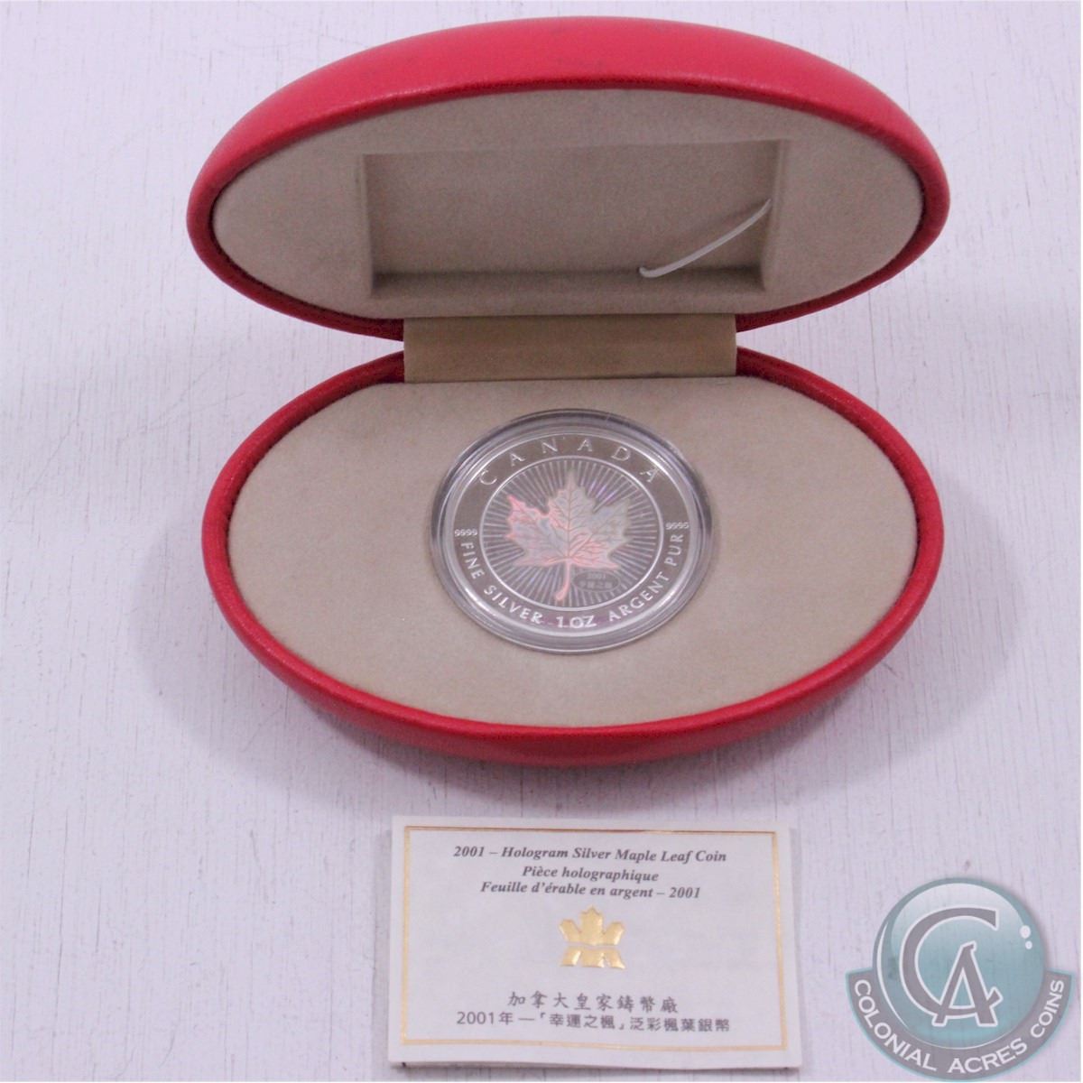 RCM Issue: 2001 $5 Hologram 1oz. Silver Maple of Good Fortune. This Coin comes encapsulated with display box and Certificate (coin lightly scuffed). TAX Exempt
